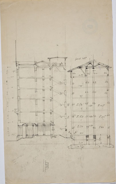 Si tratta di uno dei disegni della serie "Progetto per la costruzione della sede dell'Istituto Nazionale d'Assicurazione per gli Infortuni sul Lavoro in via Coroneo" eseguiti da Arduino Berlam, cfr. schede CMSAOAR10_4245 - CMSAOAR10_4271. Nel dicembre 1922 Arduino Berlam venne invitato a partecipare al concorso per la sede dell'Istituto Nazionale d'Assicurazione per gli Infortuni sul Lavoro, che sarebbe stata realizzata in via Coroneo a Trieste. Egli presentò la sua proposta il 14 marzo 1923, che non venne selezionata: fu preferito il progetto degli architetti Enrico e Umberto Nordio. Il disegno illustra lo schizzo delle sezioni dell'edificio. Per ulteriori considerazioni si rinvia alla tavola CMSAOAR10_4269.