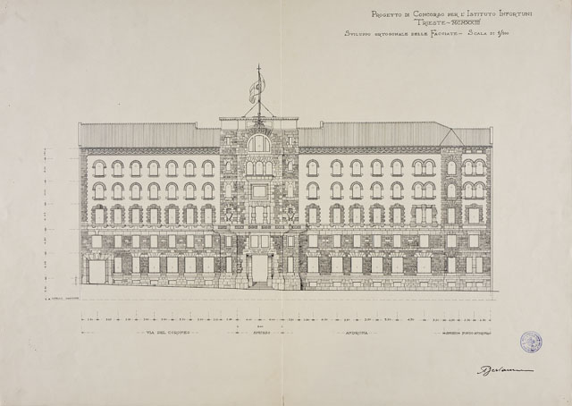 Si tratta di uno dei disegni della serie "Progetto per la costruzione della sede dell'Istituto Nazionale d'Assicurazione per gli Infortuni sul Lavoro in via Coroneo" eseguiti da Arduino Berlam, cfr. schede CMSAOAR10_4245 - CMSAOAR10_4271. Nel dicembre 1922 Berlam venne invitato a partecipare al concorso ristretto a inviti per la sede dell'Istituto Nazionale d'Assicurazione per gli Infortuni sul Lavoro, che sarebbe stata realizzata in via Coroneo. "Il bando prescriveva il perimetro dell'edificio e determinava l'esatta quadratura di ogni singolo ambiente, in base a un progetto elaborato in precedenza dal fiduciario tecnico dell'Istituto. Erano prescritte altresì l'altezza dei piani e varie altre esigenze, di modo che meglio risolveva il problema chi maggiormente s'avvicinava al progetto base" (Berlam 1923). Arduino Berlam presentò la sua proposta il 14 marzo 1923, che non venne selezionata: fu preferito il progetto degli architetti Enrico e Umberto Nordio. Il disegno in esame illustra il prospetto dell'edificio. Berlam propone un ampio uso del bugnato a blocchi rettangolari lavorati grossolanamente per ricoprire il livello sotterraneo, il piano terra e il primo piano dell’edificio, per gli smussi, oltre all’uso quali conci per inquadrare le finestre degli altri piani elevati. Nella relazione di corredo al progetto l’architetto suggerisce l’uso della pietra calcarea di Aurisina e dell’arenaria azzurognola di Muggia, “opportunamente alternate e armonizzate”. Nel disegno l’arenaria è indicata con il tratteggio, la pietra calcarea a punteggiature. I fondi di muro del secondo, terzo e quarto piano “saranno d’intonaco di malta […] trattato a cazzuola e quindi tinteggiato a calce in colore bianco-avorio per dare spicco alla pietra oscura”. Sotto la linda aveva ipotizzato un fregio a colori per “dare un po’ di brio alla facciata, che altrimenti sarebbe un po’ troppo severa” (cfr. Relazione allegata).