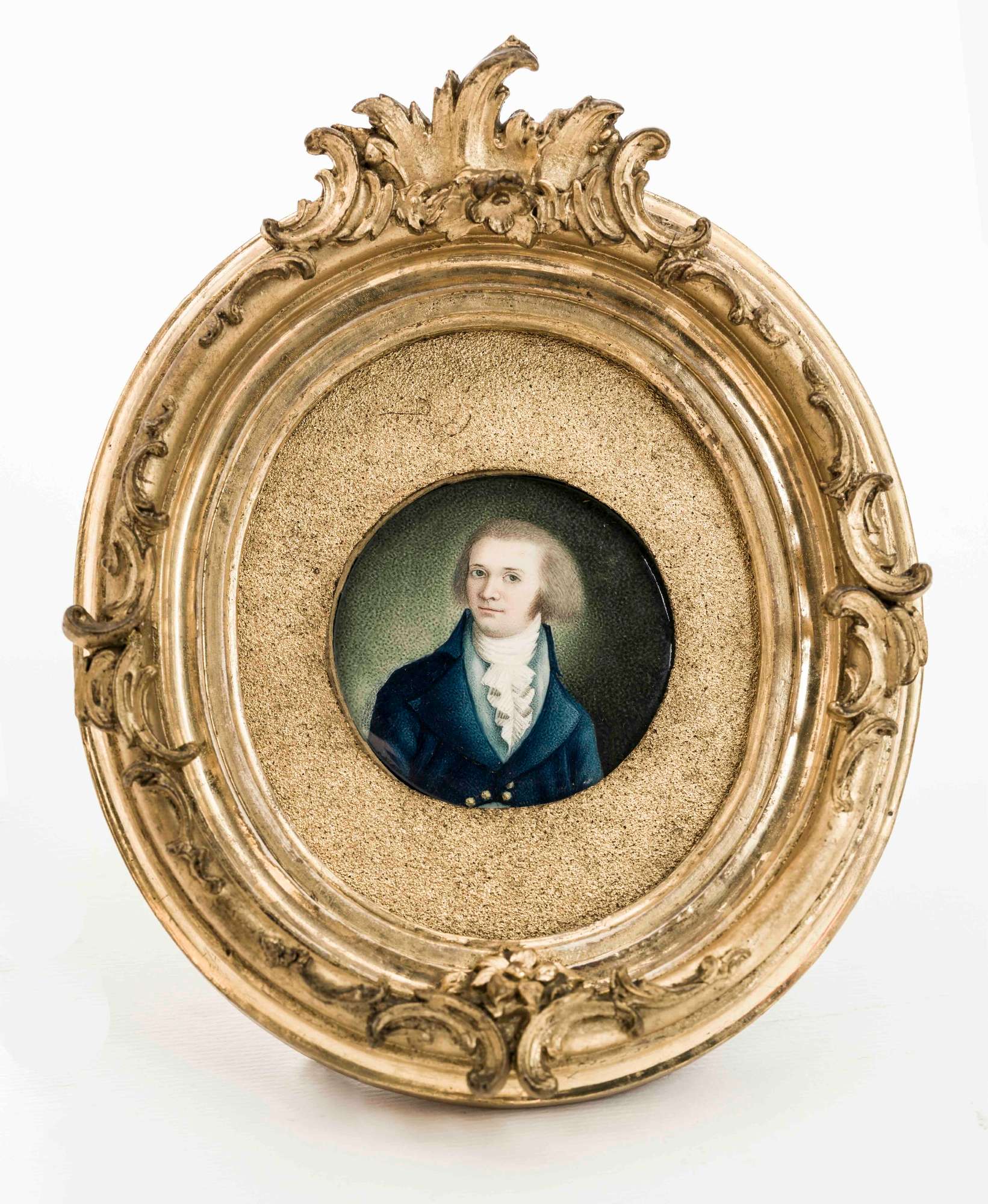 La miniatura, entrata nelle collezioni civiche nel 1976 attraverso il legato Rusconi-Opuich, ritrae un uomo a mezza figura, che indossa una marsina blu con bottoni dorati, gilet azzurro con una cravatta in pizzo annodata al collo e che porta una parrucca incipriata; elementi che suggeriscono una datazione all’ultimo quarto del XVIII secolo.