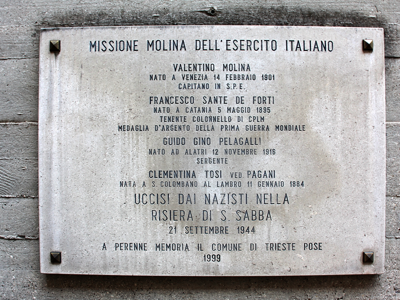La targa ricorda i quattro caduti della missione alleata del capitano Valentino Molina: il capitano stesso, il tenente colonnello Francesco Sante De Forti, Guido Gino Pelagalli e la signora Clementina Tosi vedova Pagani, uccisi il 21 settembre 1944. La storia legata a questa vicenda riguarda la radio che trasmetteva dall'abitazione di Clementina Tosi di Trieste, in via Ireneo della Croce. La radio era stata portata a Trieste alla fine del gennaio del 1944 da Valentino Molina, capitano dei Bersaglieri e da Enzo Barzellato, radiotelegrafista della Marina. Da questa storia è tratto il libro per bambini "La trisnonna Clementina e la Risiera di San Sabba", edito a Trieste nel 2020.