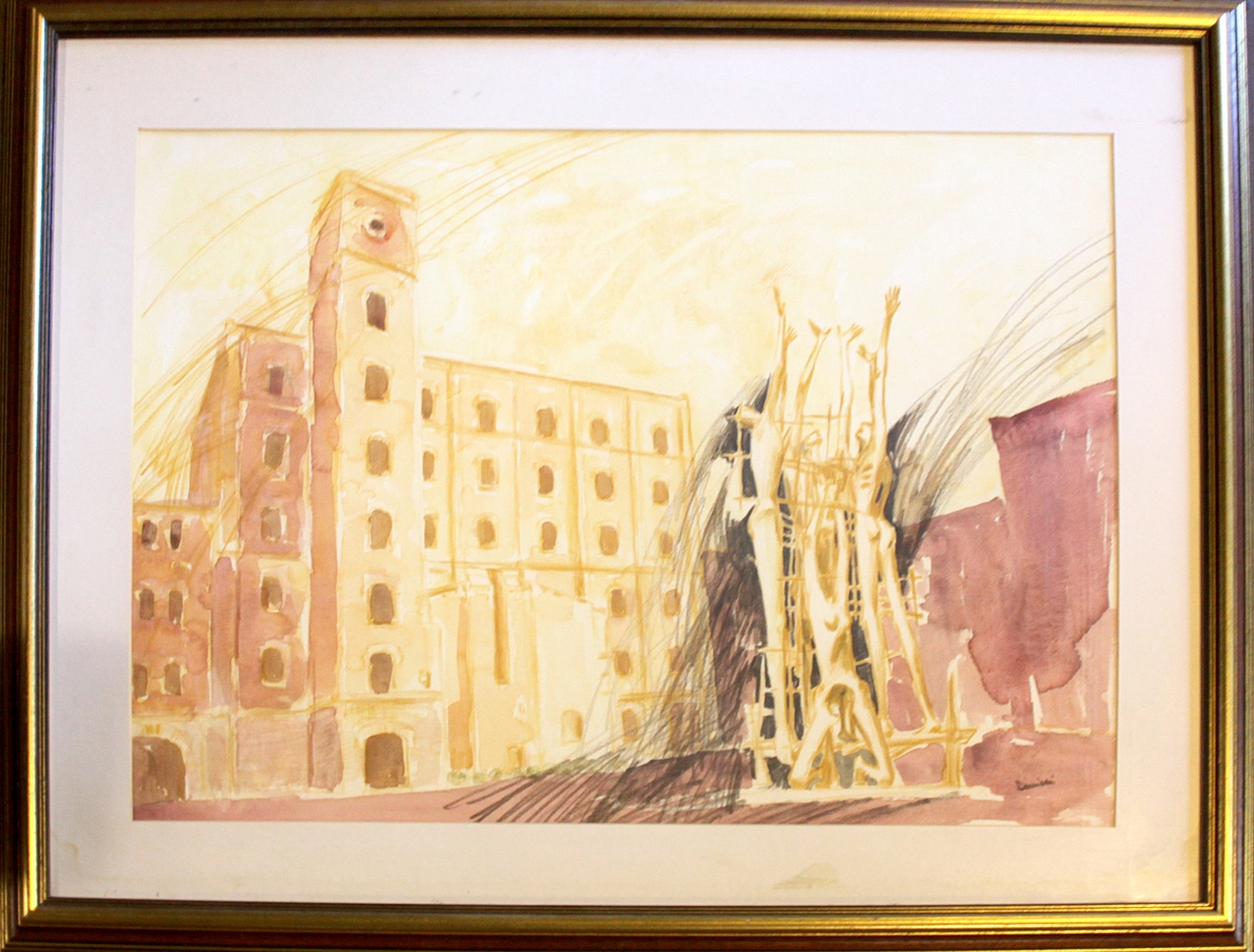 L'opera rappresenta la Risiera di San Sabba, in particolare sulla sinistra si vede uno scorcio dell'edificio di 6 piani visto dal cortile centrale, reso in rosso e giallo con segni grafici gialli, e sulla destra la scultura "I martiri" di Marcello Mascherini, dietro a essa i due edifici di quattro e tre piani, senza dettagli, di colore rosso scuro. L'opera plastica è resa con un colore giallo e attorno segni grafici, neri, decisi.