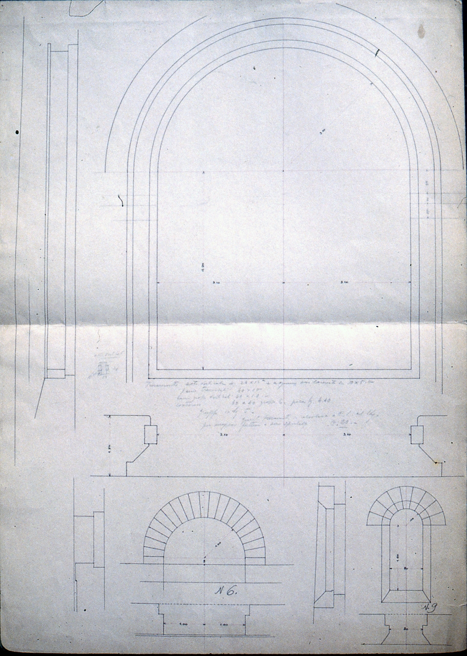Il disegno rappresenta particolari della sezione posteriore del Tempio israelitico. Può essere attribuito a Ruggero Berlam e datato 1907.