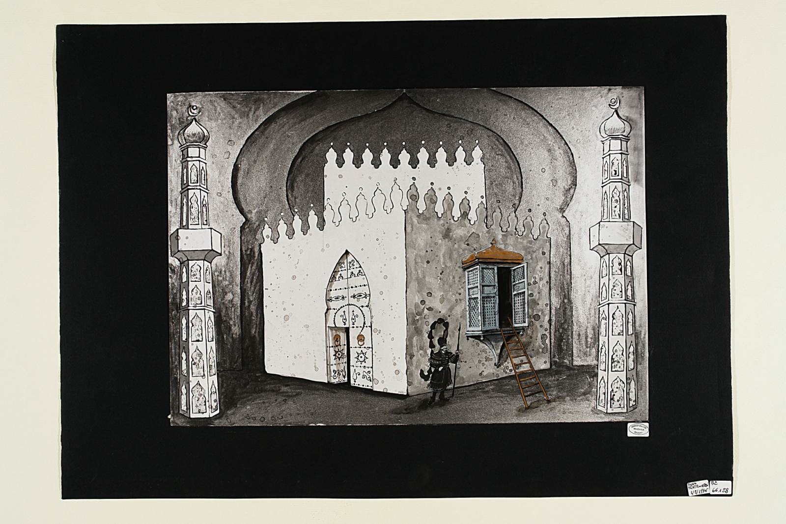 Il Ratto dal serraglio, opera di Wolfgang Amadeus Mozart, atto 3., palazzo del Pascià Selim con due minareti. Sulla facciata bovindo con scala a pioli. Figura maschile davanti la facciata