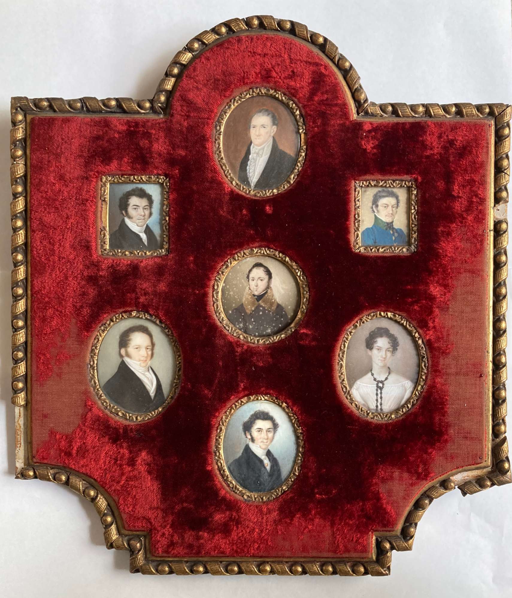 Cornice in legno dorato, ricoperta di velluto rosso, contenente sette miniature con sei ritratti maschili e uno femminile.