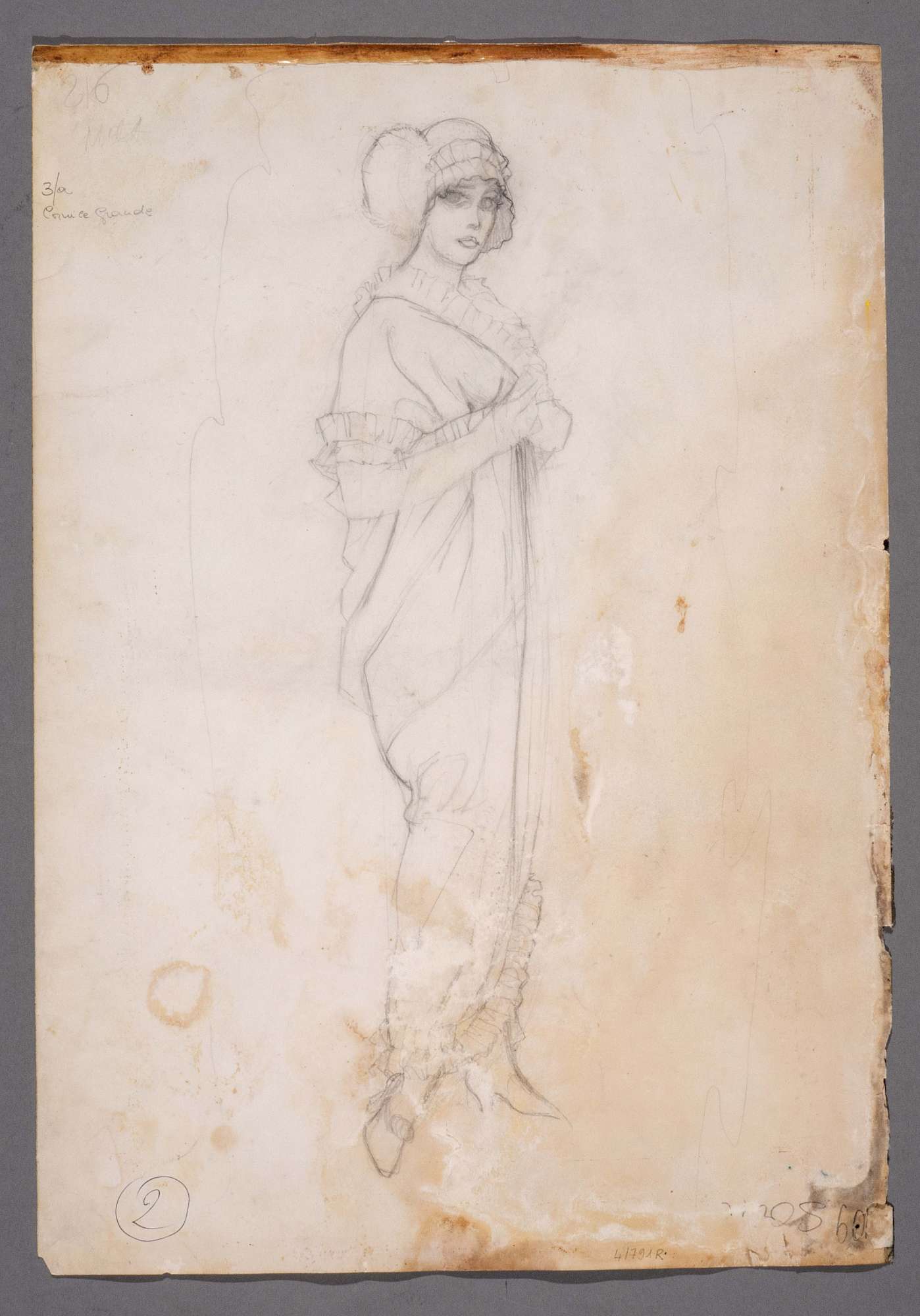 L'opera da tre soldi, di Bertolt Brecht e Kurt Weill, regia di Giorgio Strehler. Figurino di figura femminile in vestaglia e cuffietta epoca Belle époque