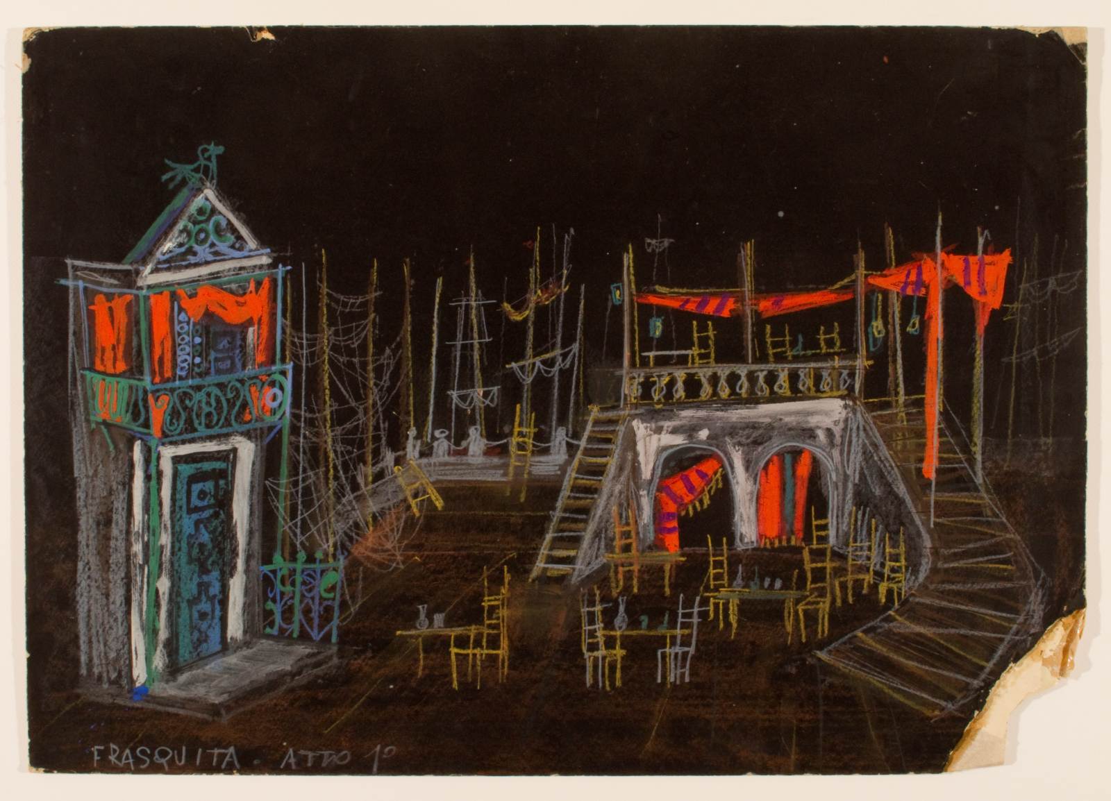 Frasquita, operetta di Franz Lehar, atto 1. scena esterna di piazza con tavolini di bar, a destra alta struttura a terrazza con archi sottostanti e scalini, sovrastata da tendaggi. A sinistra edificio con porta e balcone, sul fondo alberi di velieri