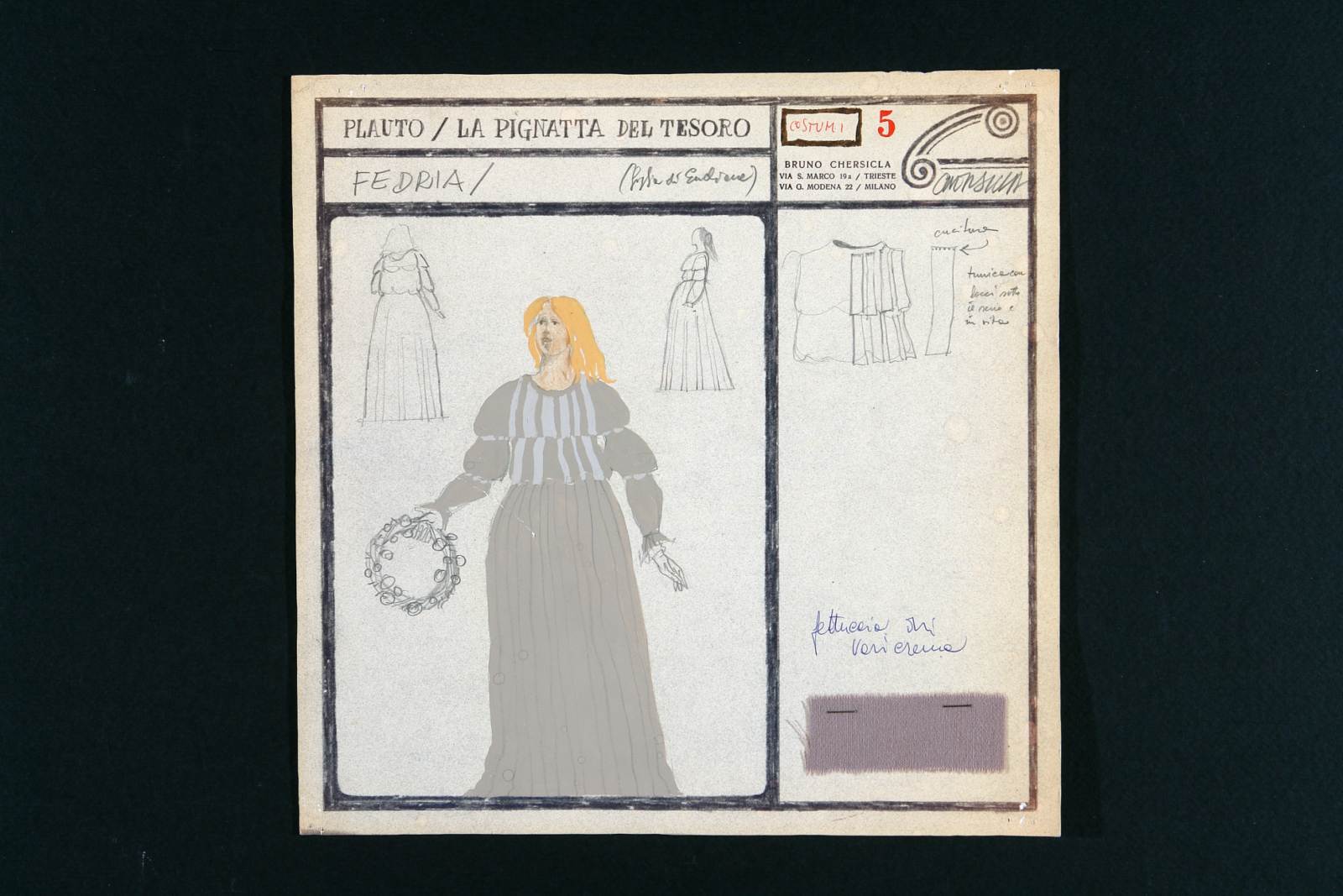Figurino per Aulularia (La pignatta), testo teatrale di Tito Maccio Plauto (elaborazione di Lino Carpinteri e Mariano Faraguna), regia Ugo Amodeo, Teatro Auditorium e Teatro Romano dal 1 al 28 giugno 1966