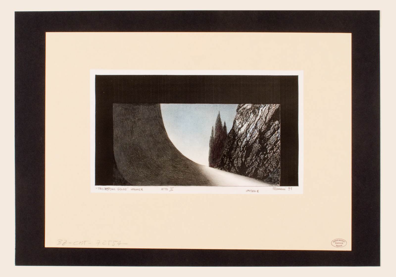 Tristan und Isolde, atto 2. A sinistra striscia continua ad ampia curvatura, sulla destra parete rocciosa che termina in gruppo d'alberi sullo sfondo, cielo bianco azzurro, boccascena nero unito