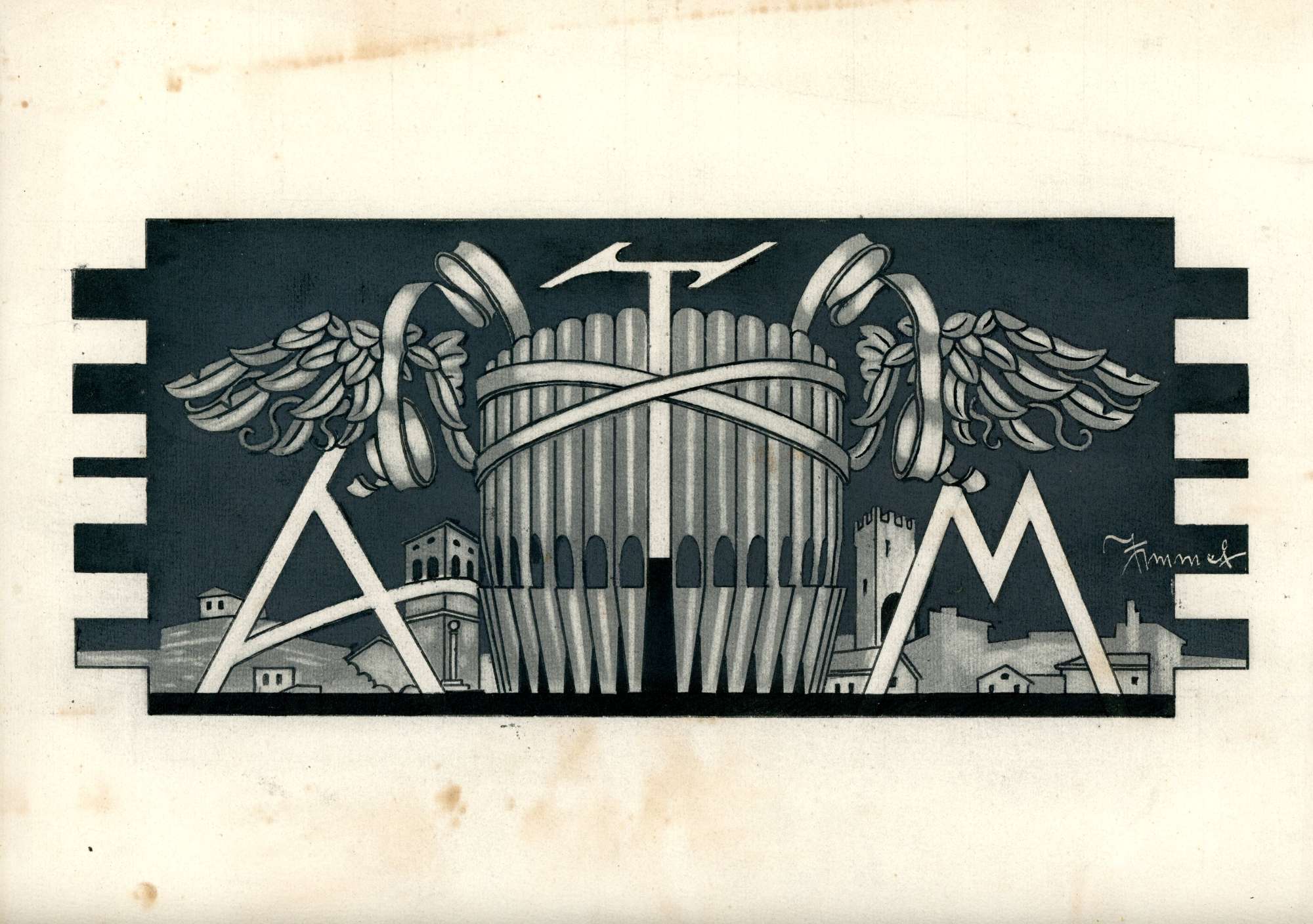 Bozzetto per decorazione di testata di giornale con fascio di canne d'organo, scorcio di Trieste con il campanile di San Giusto e le lettere ATM
