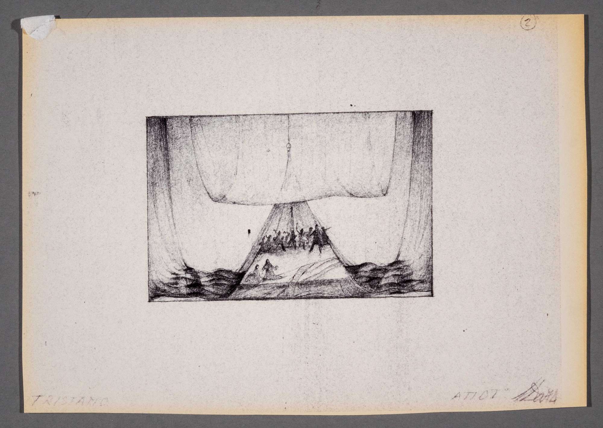 Tristano e Isotta, opera di Richard Wagner. Atto 1. Struttura triangolare al centro, in mezzo ad un mare ondoso fatto di veli su cui stanno figure umane. Un altro velo scende dal soffitto.