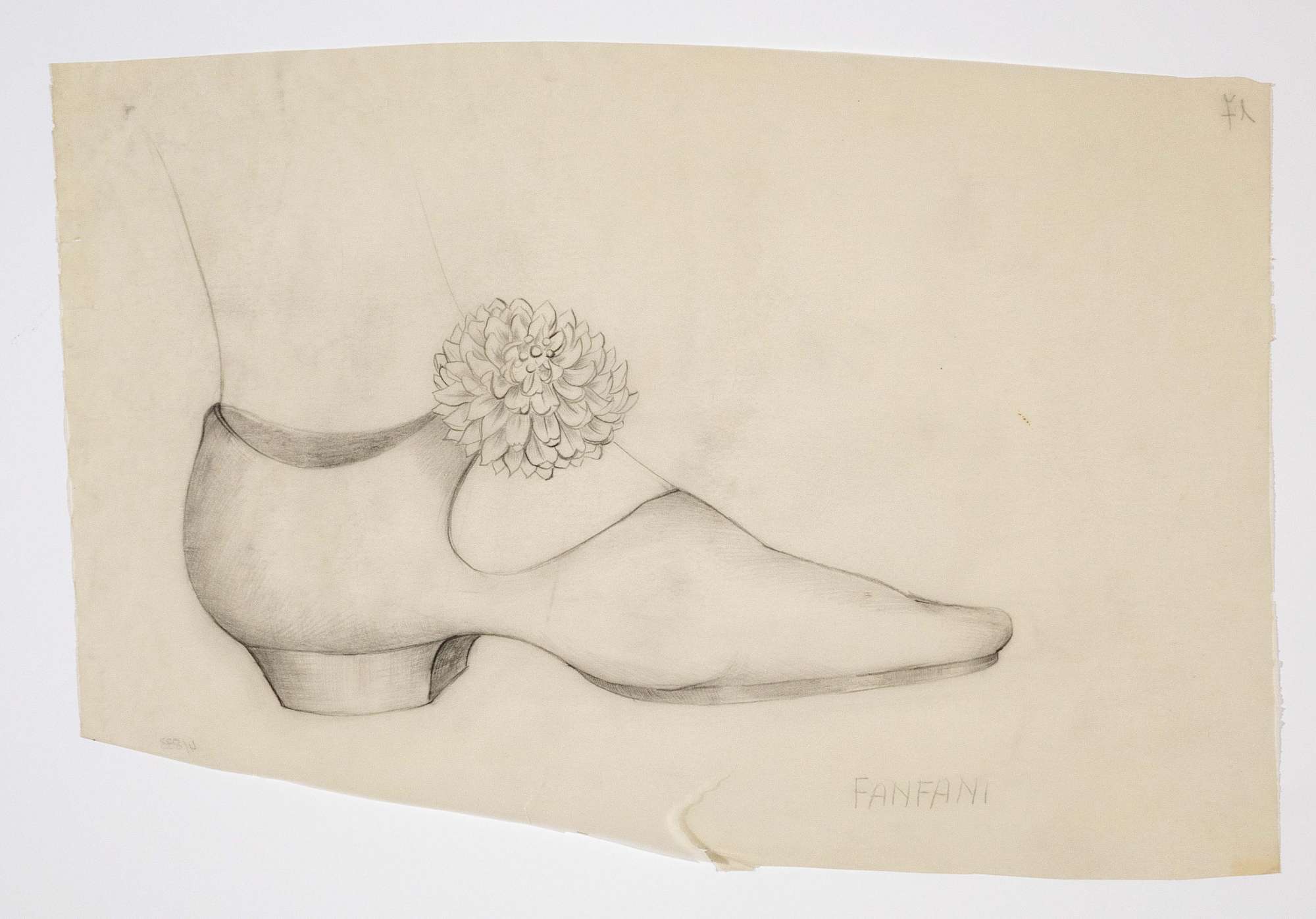 Il gioco dei potenti, libero adattamento di Giorgio Strehler da Enrico VI, dramma storico di William Shakespeare, in 15 atti e 2 giornate. Calzatura con tacco basso con pon-pon floreale, di profilo verso destra.