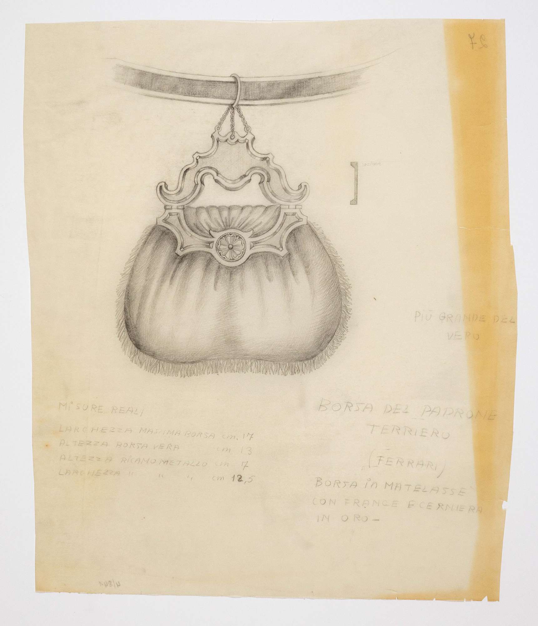 Il gioco dei potenti, libero adattamento di Giorgio Strehler da Enrico VI, dramma storico di William Shakespeare, in 15 atti e 2 giornate. Borsetta in materiale morbido, con frange e chiusura operata metallica, appesa alla cintura tramite un gancio, catenelle e placchetta operata in metallo.
