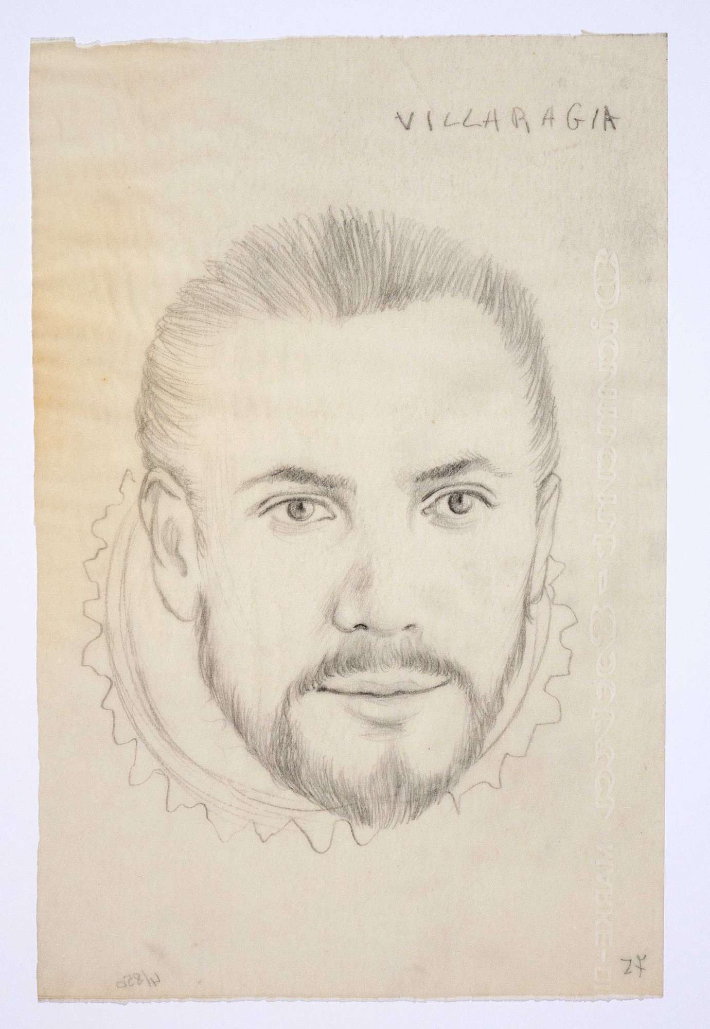 Il gioco dei potenti, libero adattamento di Giorgio Strehler da Enrico VI, dramma storico di William Shakespeare, in 15 atti e 2 giornate. Ritratto di testa maschile di fronte, a capo scoperto, barba e baffi.
