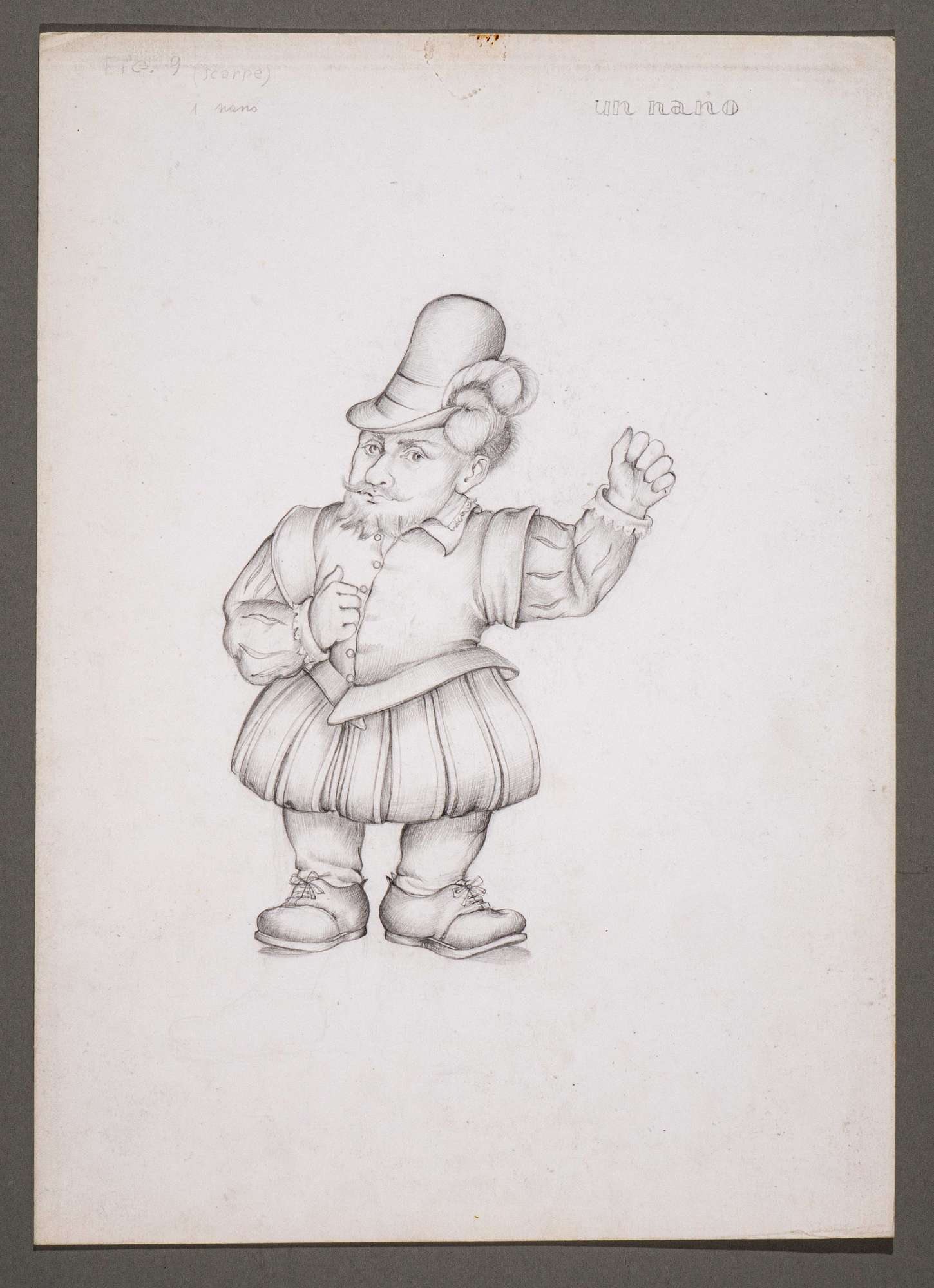 Il gioco dei potenti, libero adattamento di Giorgio Strehler da Enrico VI, dramma storico di William Shakespeare, in 15 atti e 2 giornate. Figura maschile di nano in piedi raffigurato di fronte con ila capo leggermente girato a sinistra. Indossa un copricapo alto piumato, calzoncini a palloncino con fenditure a casacca.