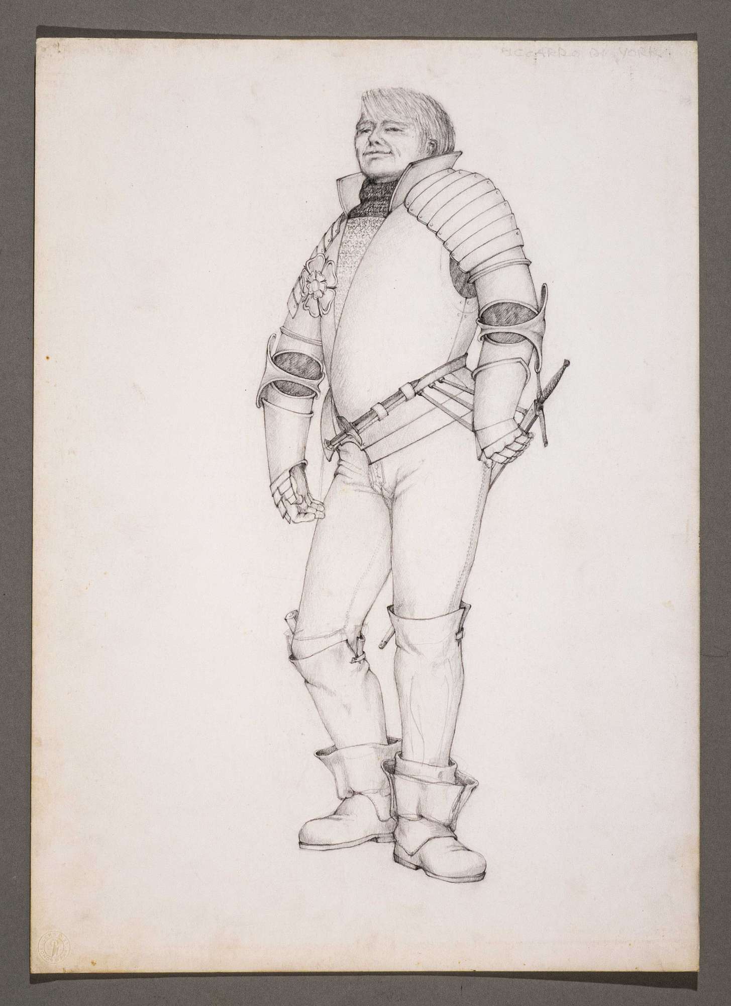 Il gioco dei potenti, libero adattamento di Giorgio Strehler da Enrico VI, dramma storico di William Shakespeare, in 15 atti e 2 giornate. Figura maschile in piedi, di tre quarti verso sinistra, ritratto dal basso. Indossa una corazza completa di mitteni alle mani, calzamaglia, gambali e corti stivali con ampio risvolto, reca due armi: un pugnale in vita e una spada infilata nel fodero sul retro