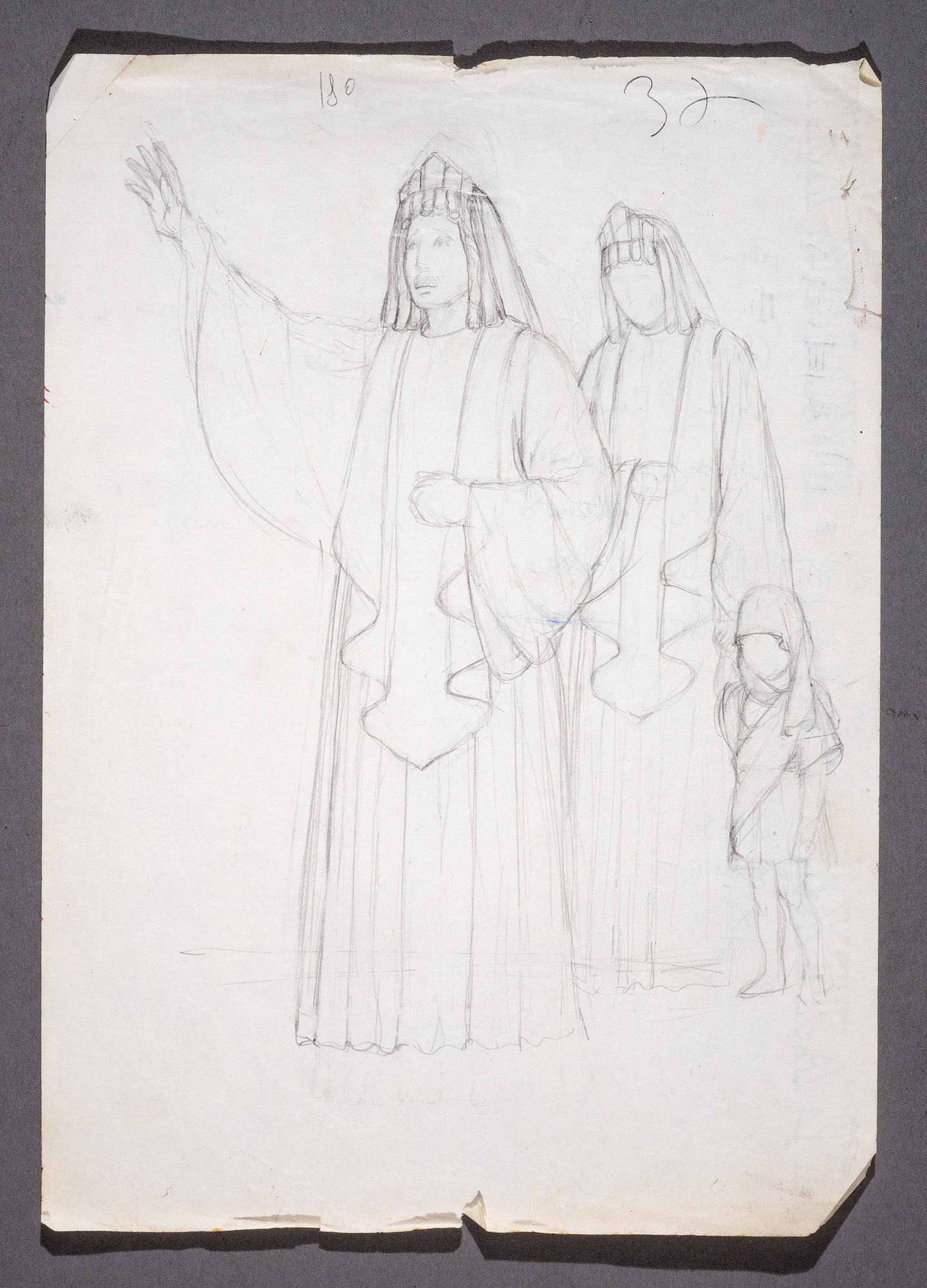 Coriolano, tragedia di William Shakespeare. Gruppo di figure togate e un bambino, leggermente di tre quarti verso sinistra