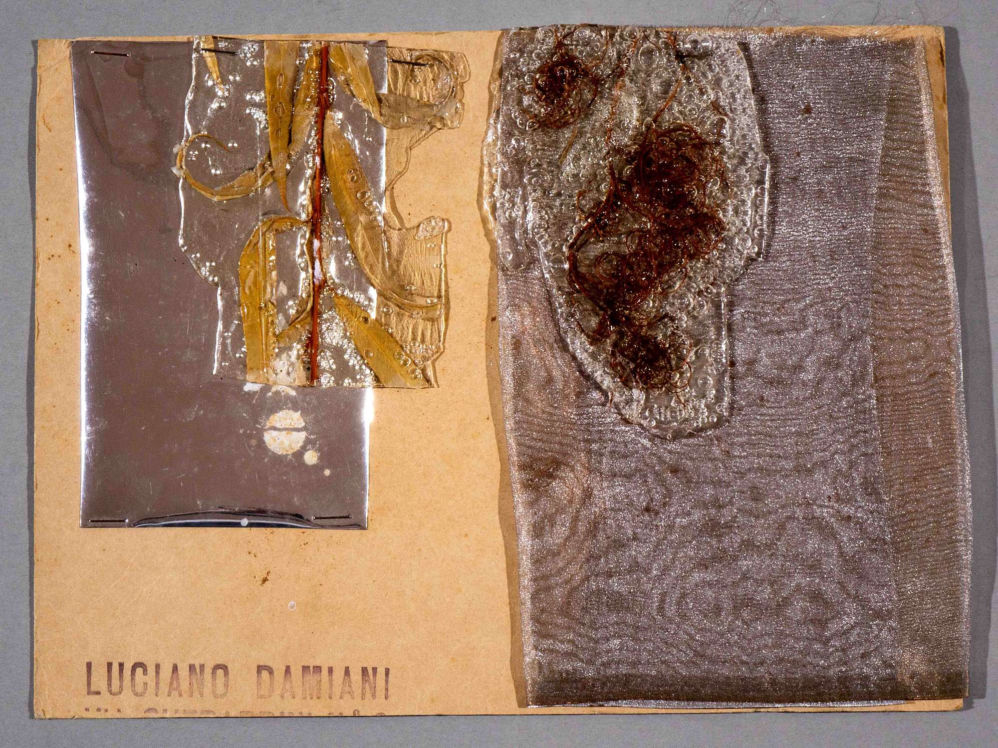 Die Zauberflöte, Singspiel di Emmanuel Schikaneder e Wolfgang Amadeus Mozart. Studo per la realizzazione dei "teli-palma". Materiale vegetale inglobato in due colate di colla, posizionate l'una, a sinistra, su cartoncino di alluminio e l'altra, a destra, su un tulle cangiante.