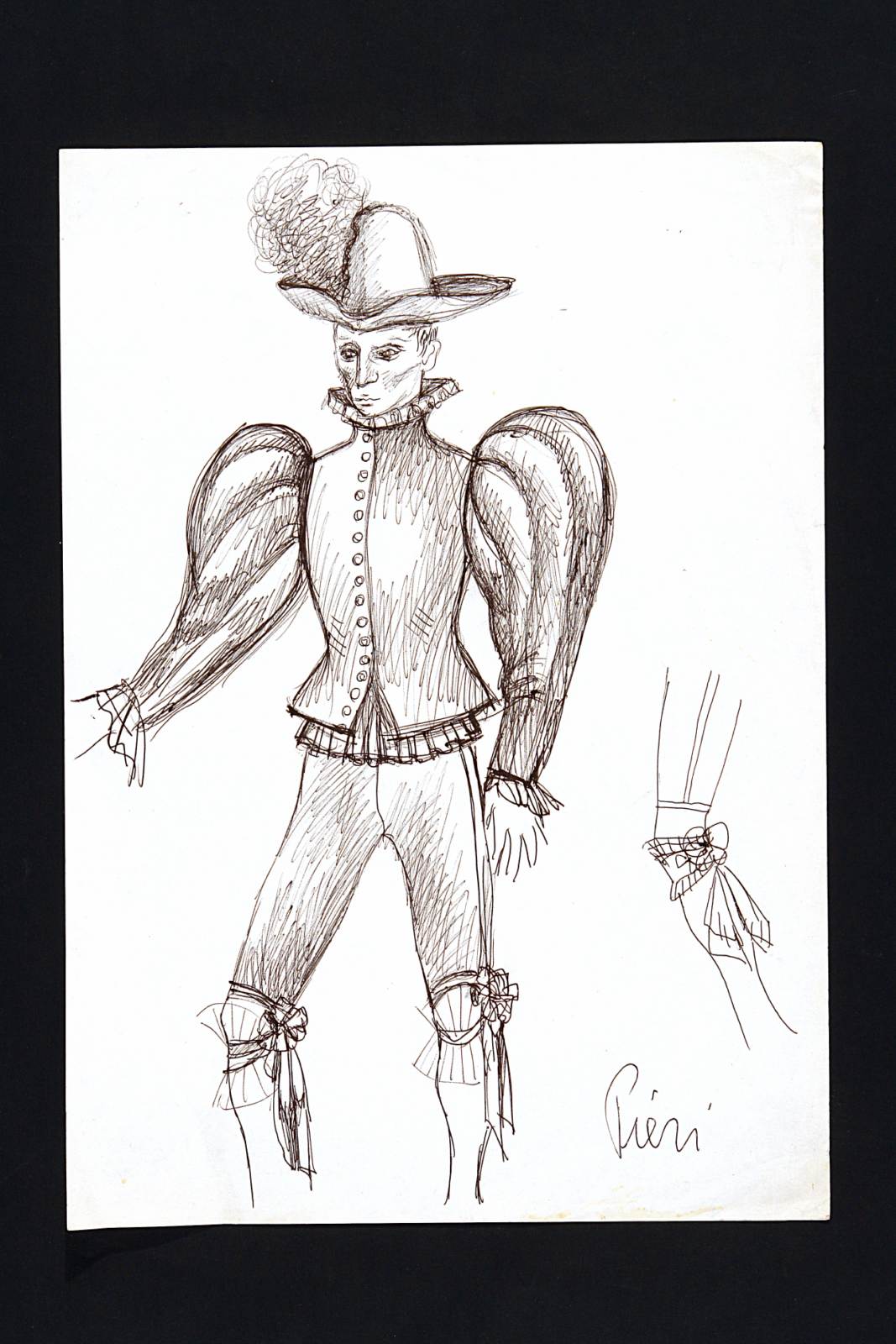 Come vi piace, commedia pastorale di William Shakespeare. Figura maschile intera, leggermente di tre quarti verso destra, in abito cinquecentesco, brache al ginocchio con giarrettiere chiuse da coccarde, giubba con spalle rigonfie e collo alto e largo, cappello con piuma ariosa. A destra particolare della coccarda.