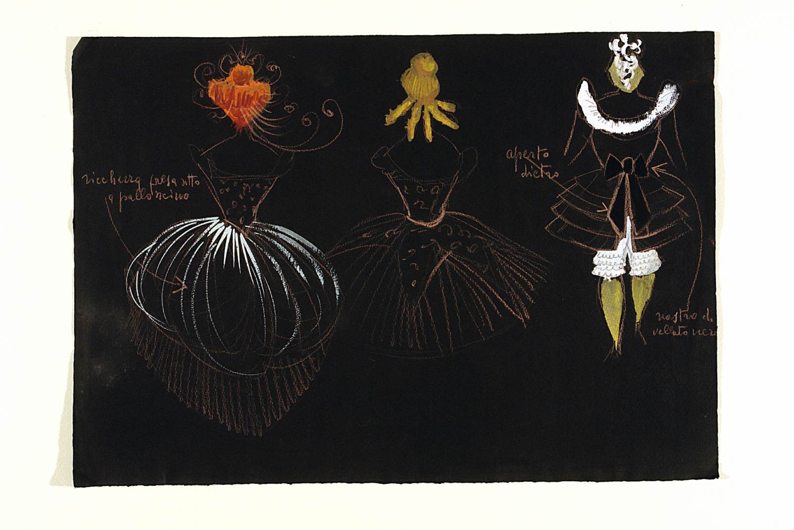 Studio per tre abiti femminili da ballerina visti da dietro. Corrispondono ai figurini CMT_OA_4_000471, CMT_OA_4_000472, CMT_OA_4_000473