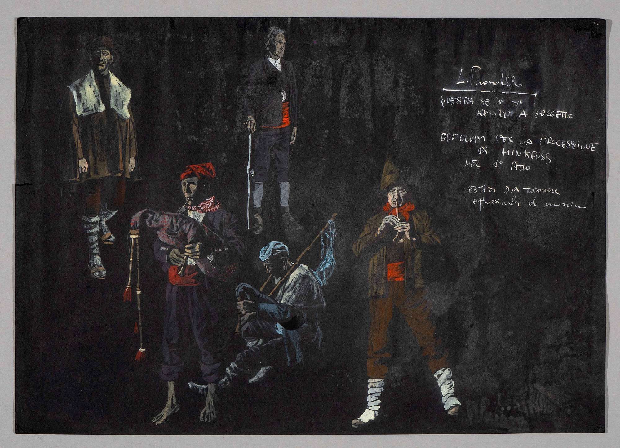 Questa sera si recita a soggetto, commedia di Luigi Pirandello. Cinque personaggi maschili per la processione di Hinkfuss. Abiti popolari e pastorali, due dei personaggi sono suonatori di zampogna, uno di ciaramella.
