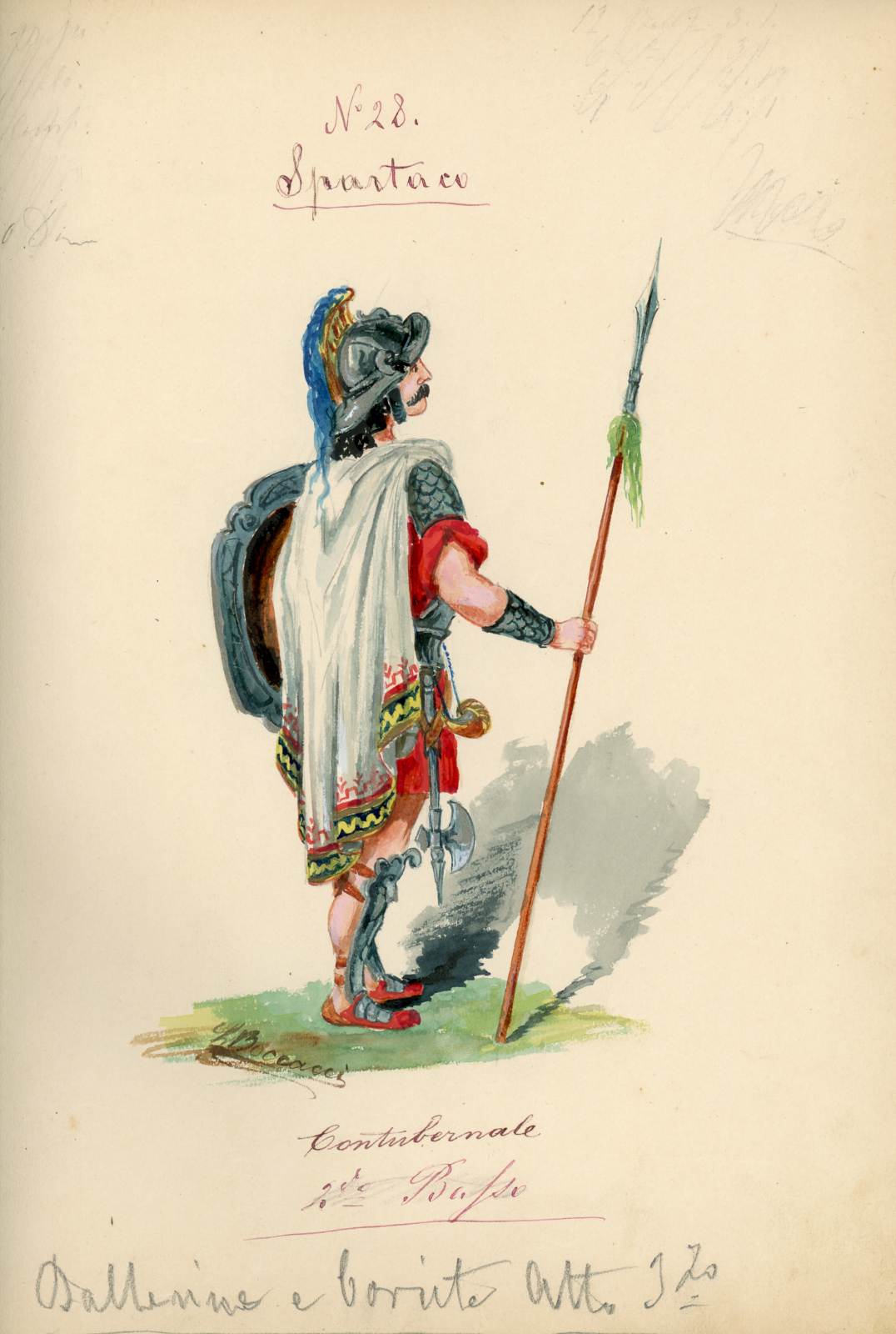 Spartaco, opera di Giuseppe Sinico. Figurino per il personaggio Contubernale. Figura maschile intera, girata di schiena di 3/4, in abbigliamento militare. Corta tunica rossa, corazza a squame, sandali e schinieri; lancia appoggiata a terra nella mano destra, scudi nella sinistra.