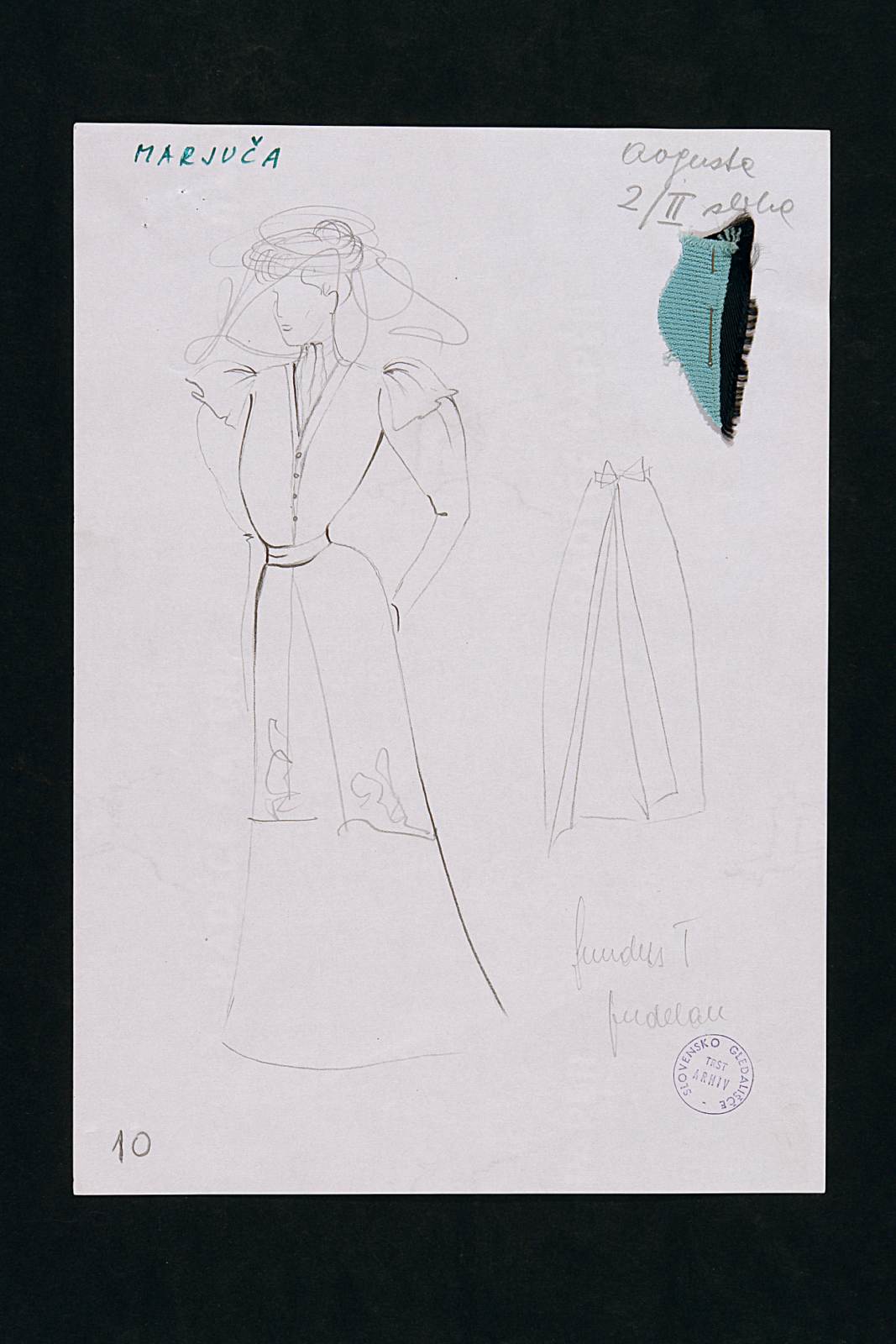 La coscienza di Zeno (Zenova Izpoved), di Italo Svevo nel rifacimento scenico di Tullio Kezich. Costume per Augusta. Figura femminile intera, gonna lunga, soprabito corto abbottonato sul davanti, veletta
