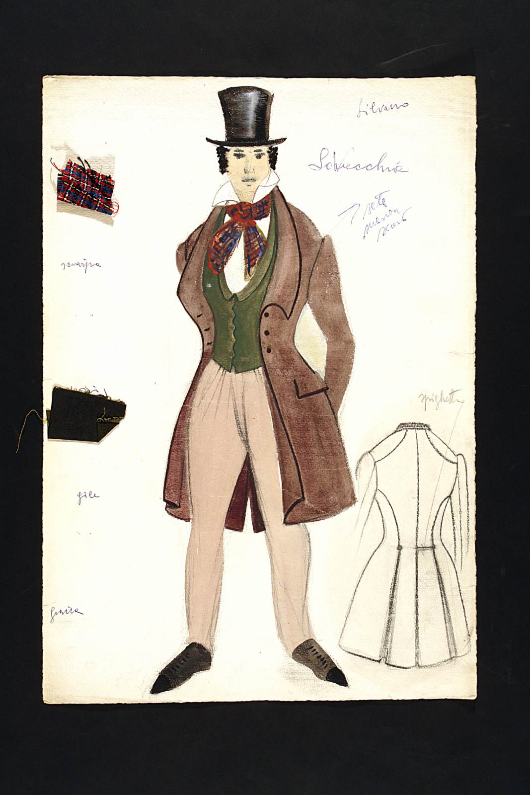 La cagnotte, testo teatrale di Eugène Labiche. Figurino per Sylvain, figura maschile intera di fronte. Pantaloni, gilet verde, redingote, sciarpa scozzese annodata sul collo, cilindro. A sinistra studio del retro della giacca