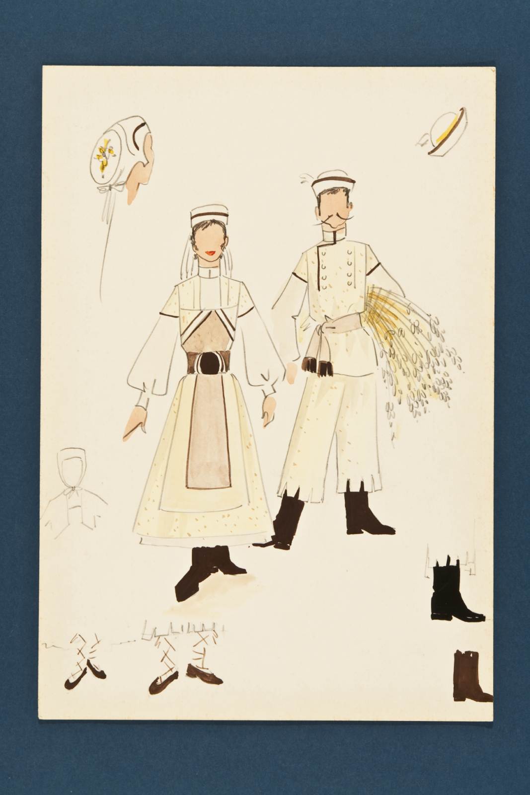 La contessa Mariza, figura maschile e femminile in costume da contadini. A destra l'uomo in casacca, fusciacca e pantalone ampio al polpaccio reca un fascio di spighe sotto braccio. La donna indossa un abito svasato a manica corta. Entrambi gli abiti sono in tinte chiare crema e rosate. In alto particolari per i copricapi, in basso particolari dei calzari e stivali.
