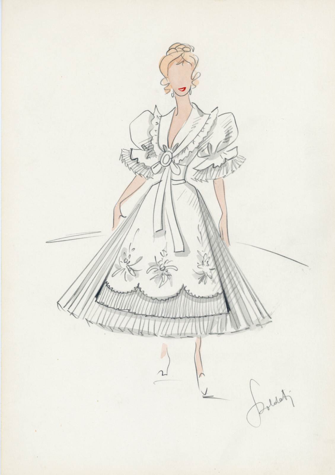 Il paese dei campanelli, operetta di Virgilio Ranzato, costume femminile bianco con camicia con ampio scollo bordato da pizzo, manica corta a palloncino con doppia balza terminale, chiuso al petto da fiocco con lungo nastro, gonna pieghettata a lunga svasatura, grembiule a motivi floreali sovrapposto