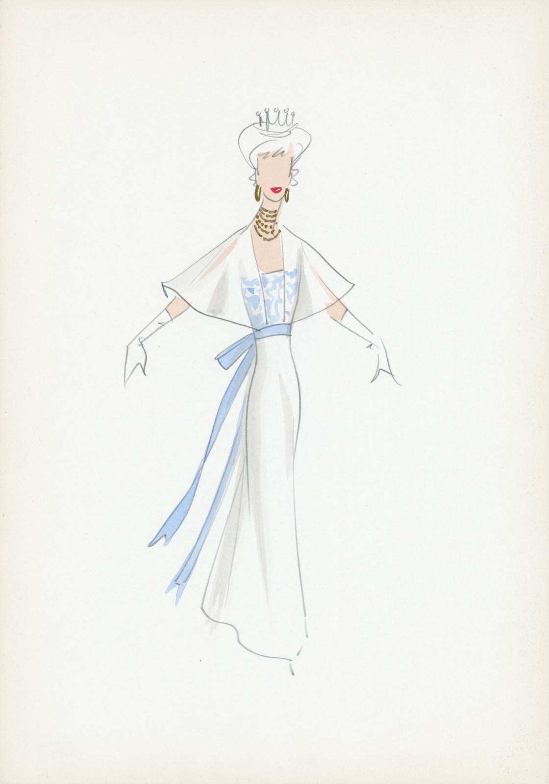 Sogno di un valzer, operetta di Oskar Strauss, costume femminile nobiliare di gala , bustino in tessuto operato, maniche trasparenti a mantellina, cintura annodata sul retro con lunghi nastri pendenti, gonna a vita rialzata, di media svasatura, lunghi guanti, corona, orecchini, collana a più fili stretti al collo