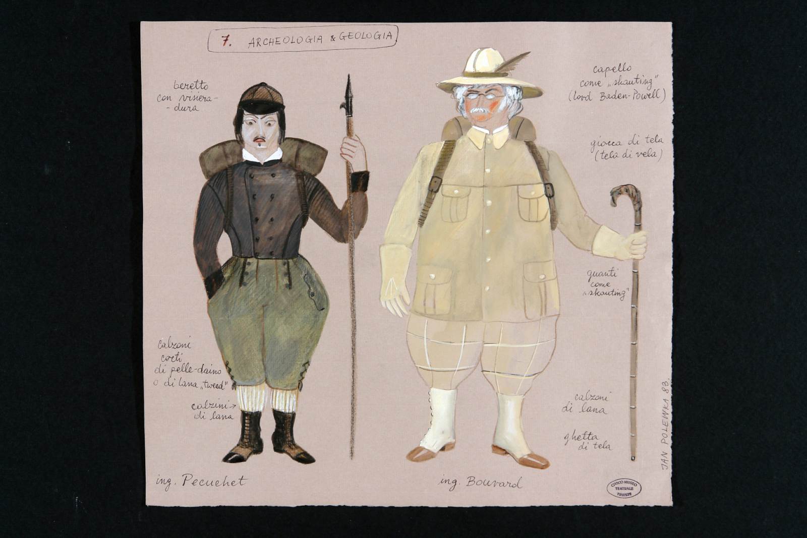 Bouvard e Pecuchet di Tullio Kezich e Luigi Squarzina da Gustave Flaubert. Personaggi: Bouvard e Pecuchet. Due figure maschili intere vestite da geologo e archeologo. La figura di sinistra indossa berretto marrone con visiera, giacchino marrone, zaino, calzone al ginocchio, calzettoni, stivaletti, asta con rampone. La figura di destra indossa: cappello a tesa larga con nastro e piuma ornamentale, giacca a quattro tasche, zaino, pantaloni alla zuava in tessuto a grandi quadri, ghette, bastone in bambù, guanti