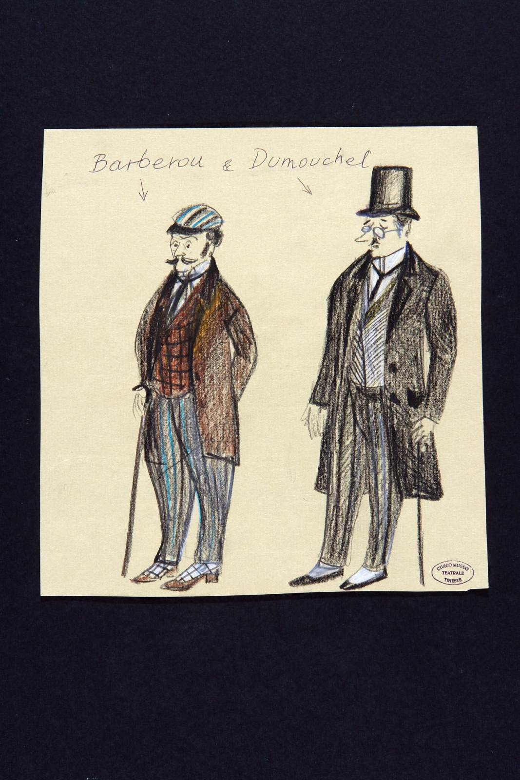 Bouvard e Pecuchet di Tullio Kezich e Luigi Squarzina da Gustave Flaubert. Personaggi: Barberou e Dumouchel. Due figure maschile vestiti da passeggio . A sinistra Barberou: berrettino rigato con frontino, camicia, cravatta, panciotto a riquadri, pantaloni rigati, soprabito, bastone, calze a quadri bicolori, scarpe scollate con tacco basso. A destra Dumouckel: indossa cappello a cilindro, camicia, cravatta, gilè spinato, pantaloni rigati, bastone, ghette bicolori