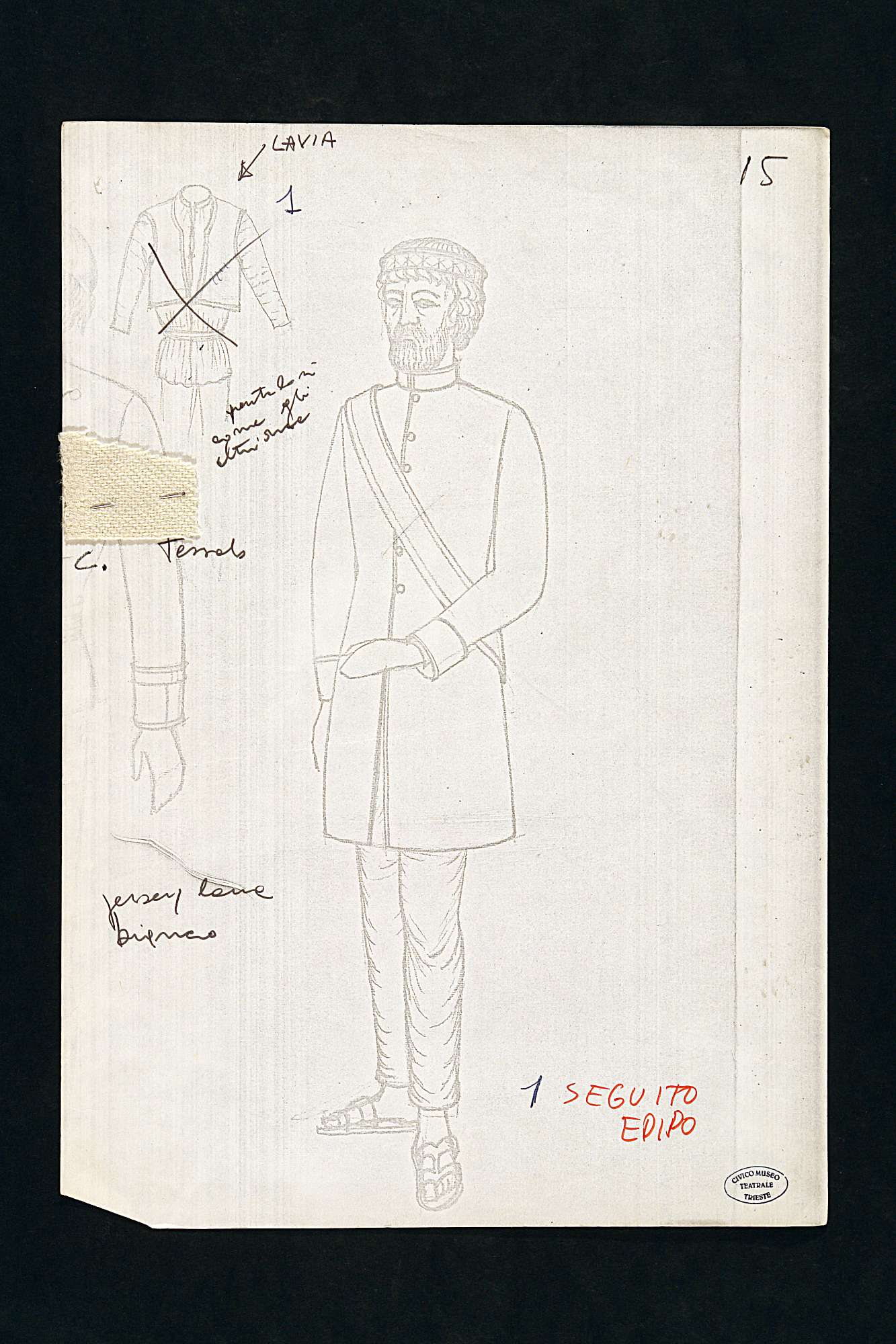 Edipo Re di Sofocle, costume per Edipo, copricapo con calotta rigida a fascia centrale e decori geometrici, abito a manica lunga con risvolto ai polsi, colletto circolare alto al collo e rigido, abbottonatura centrale di 6 bottoni, fascia traversa, pantaloni alla caviglia, sandali a fasce ai piedi. in lt a sinistra particolari di giacchino