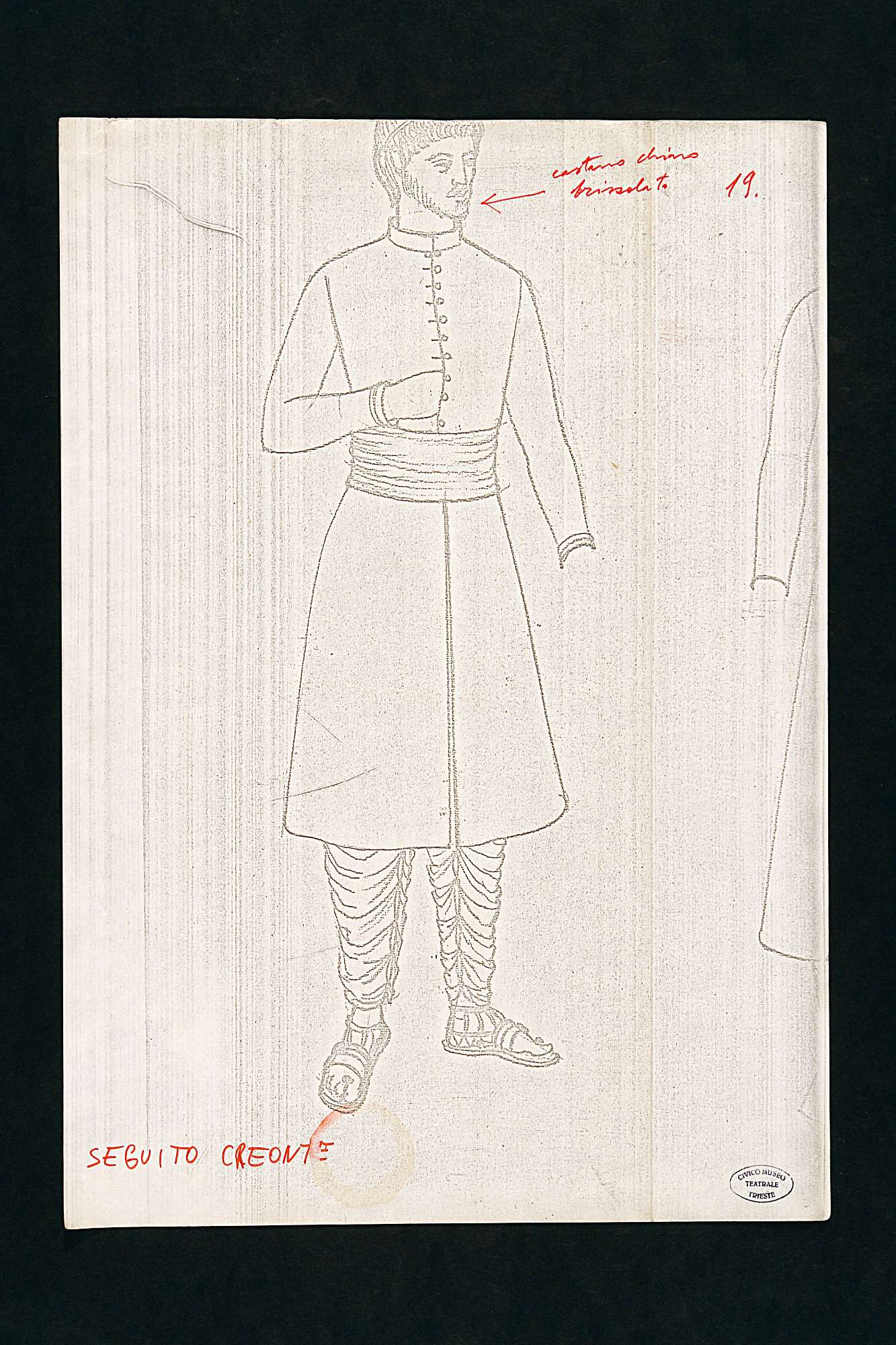 Edipo Re di Sofocle, costume per Creonte, sottile fascia ferma capelli, abito a mantello con colletto circolare alto al collo e rigido, abbottonatura centrale, alta cintura di tessuto in vita, pantaloni alla caviglia di piccoli drappeggi trattenuti da bottoni, sandali a fasce ai piedi.
