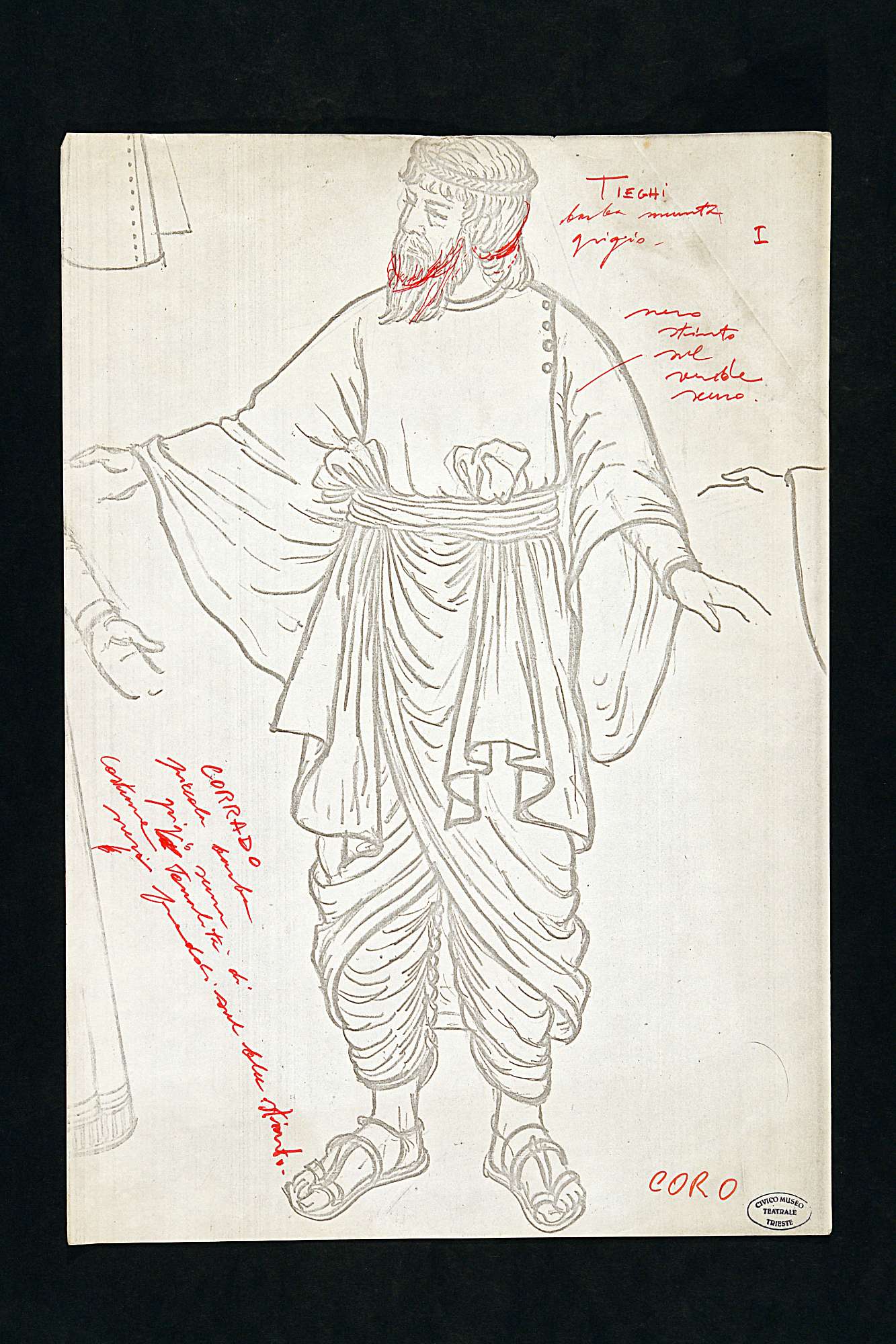 Edipo Re di Sofocle, figura maschile intera. Indossa fascia frontale, tunica con abbottonatura laterale, pantaloni alla caviglia con tessuto arricciato e bottoni laterali, sandali