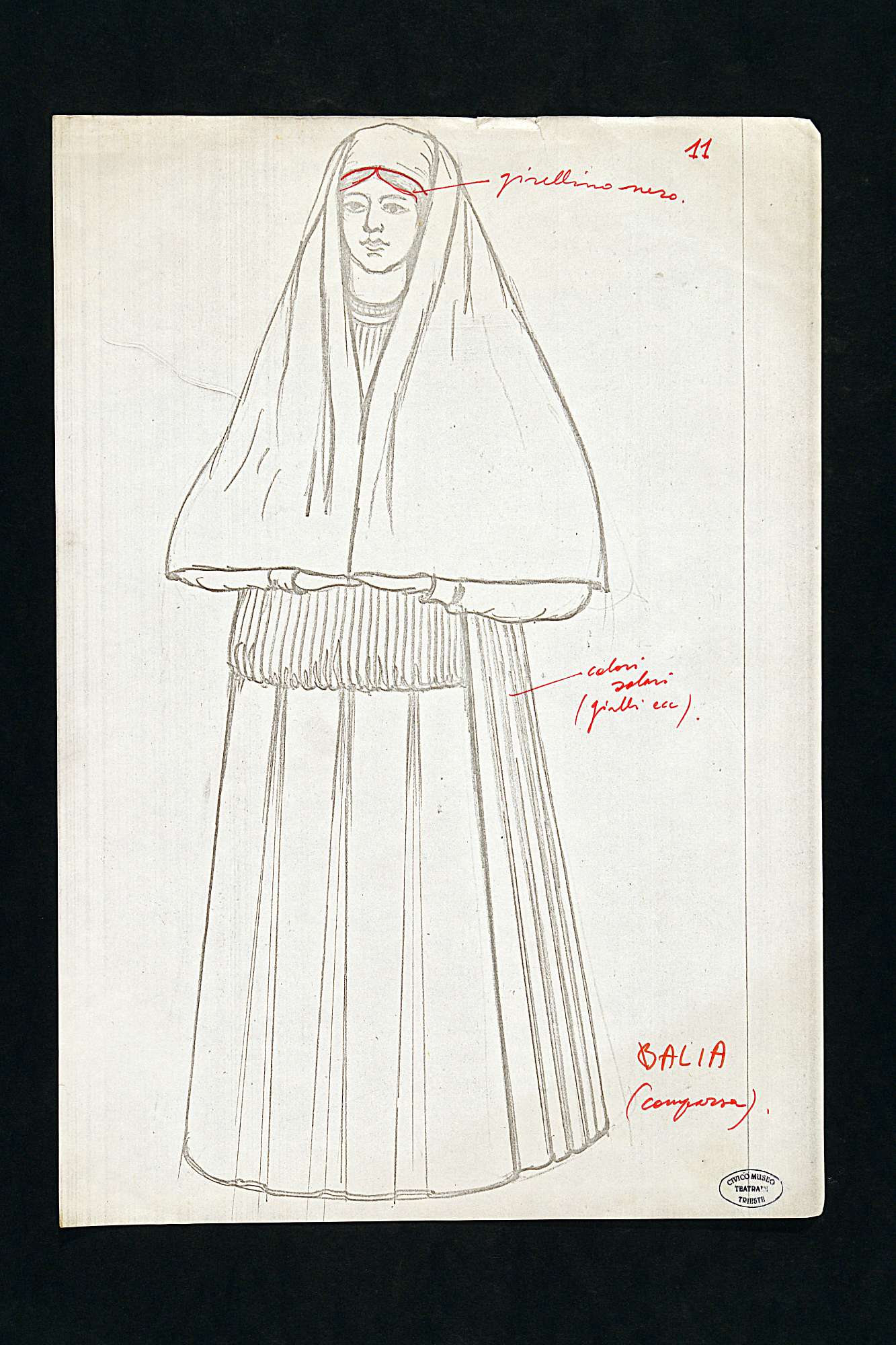 Edipo Re di Sofocle, figura femminile intera, una balia. Capo e busto coperti da pezza in tessuto, abito a piccole pieghe, gonna svasata,