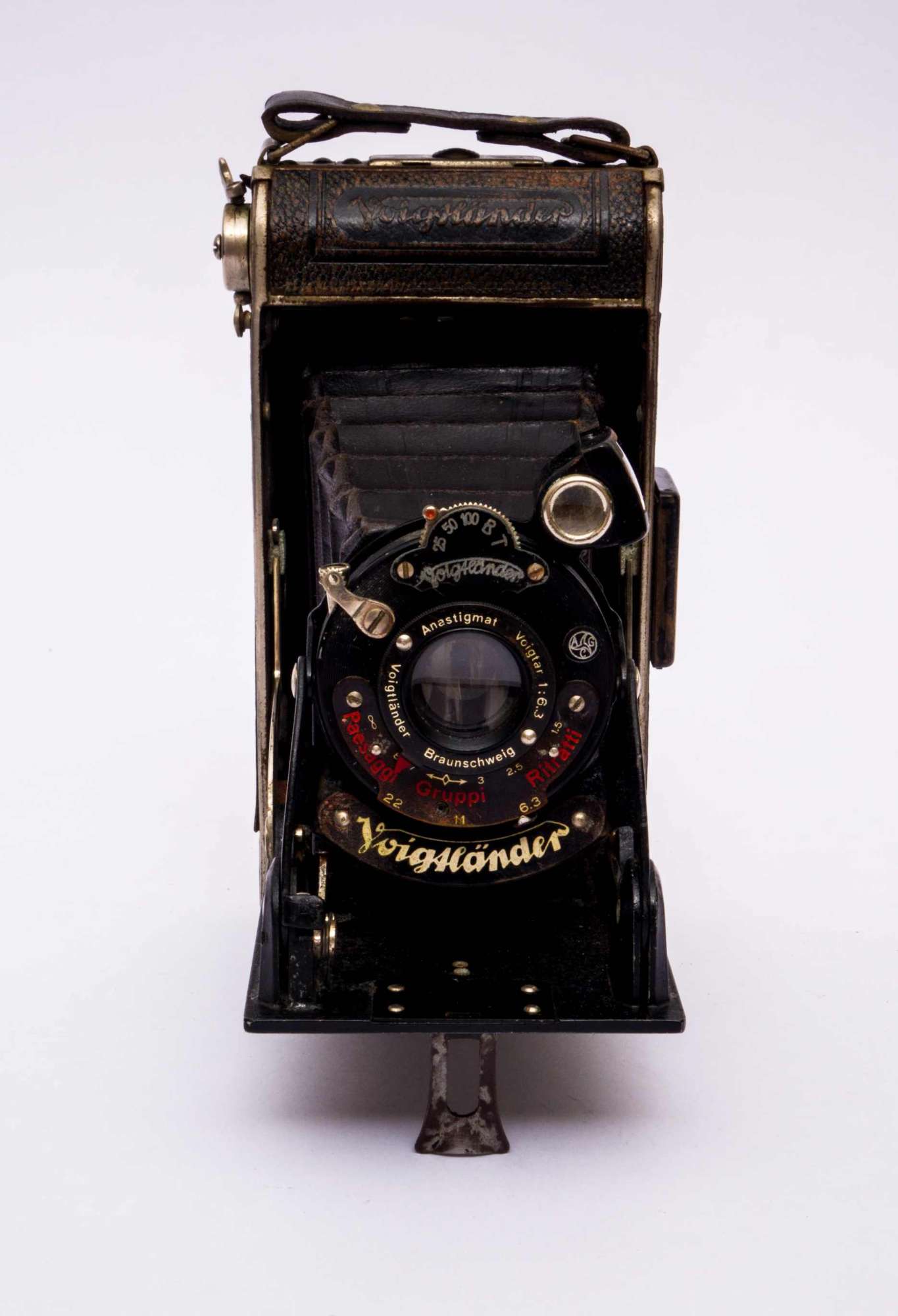 Apparecchio fotografico verticale interamente in metallo, di forma parallelepipeda, con bordi arrotondati e maniglia in cuoio. Il soffietto, in pelle nera, è custodito all'interno dell'apparecchio e viene estratto automaticamente aprendo lo sportello anteriore, incernierato nella parte inferiore della parete frontale. Lo sportello è mantenuto aperto da due tiranti in metallo. Il soffietto termina con un telaio in metallo sul quale è posizionato il porta obiettivo in metallo. Lo sportello aperto poggia su una linguetta in metallo estraibile. Sullo sportello e sul dorso sono presenti due fori filettati per il posizionamento su cavalletto. L'obiettivo è a fuoco fisso e al suo interno sono inseriti un diaframma iride ed un otturatore centrale. Mediante una ghiera posta sull'obiettivo in corrispondenza del diaframma interno, è possibile regolare l'apertura del diaframma secondo posizioni stabilite (infinito, paesaggi, 10, 7, gruppi, 3, 2.5, ritratti, 1.5). Una levetta posta nella parte superiore dell'obiettivo permette di selezionare le velocità di scatto dell'otturatore (1/25, 1/50, 1/100, 1/125 di secondo più le posizioni B e T). La carica e lo scatto dell'otturatore avvengono mediante due levette posizionate sull'obiettivo, in corrispondenza dell'otturatore. Lo scatto può essere azionato anche mediante uno scatto flessibile da inserire nell'apposito foro situato vicino alla levetta di scatto (lo scatto a distanza è mancante). Sul porta obiettivo è fissato anche un mirino a riflessione orientabile. Lateralmente, sul dorso, è inserito un mirino Newtoniano ripiegabile costituito da due parti: una piccola lente e una lente convergente rettangolare. Il dorso dell'apparecchio fotografico è incernierato sul lato ed apribile per permettere l'inserimento della pellicola in rullo per formati 6x9cm. Ad apparecchio aperto sono visibili l'interno del soffietto e i due vani laterali dove si inserisce la pellicola in rullo. L'avanzamento della pellicola avviene manualmente attraverso una farfalla posizionata lateralmente. Sulla parete posteriore si ha una finestrella trasparente rossa per la lettura diretta del numero di fotogramma dal retro della pellicola.