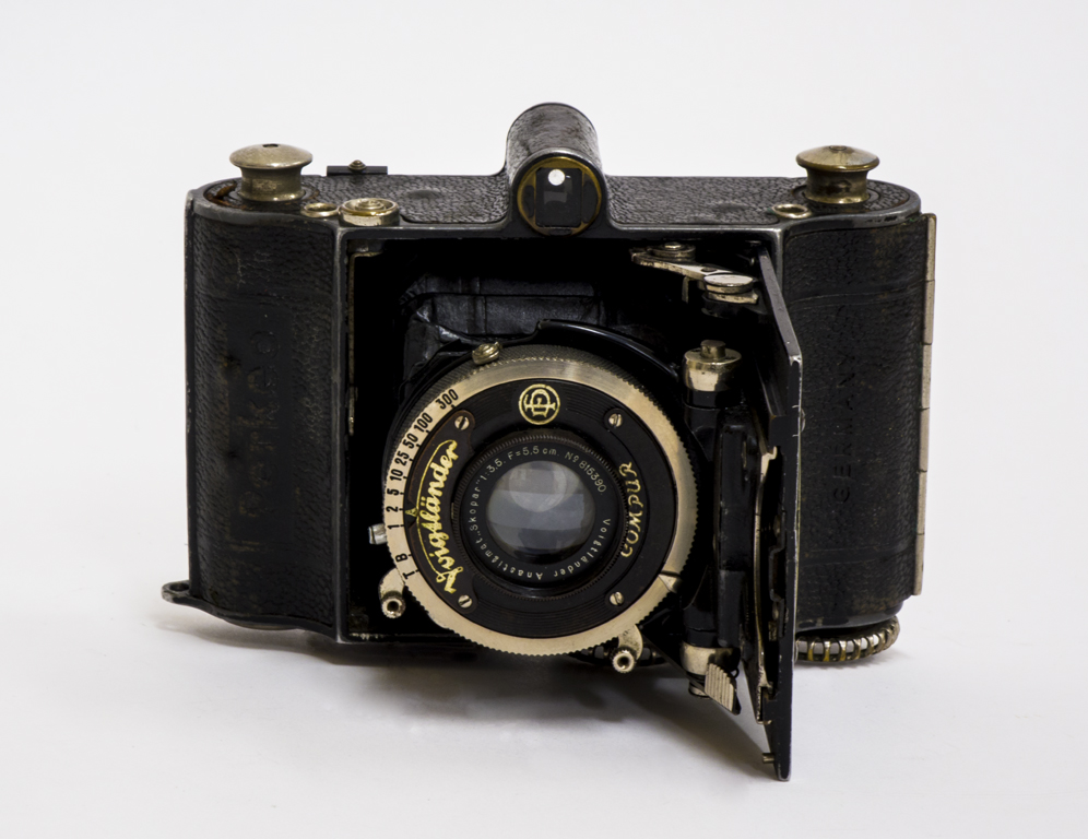 Apparecchio fotografico compatto a sviluppo verticale, in metallo ricoperto in pelle nera. L'ottica è inserita sulla parte frontale del corpo centrale. Obiettivo Compur.