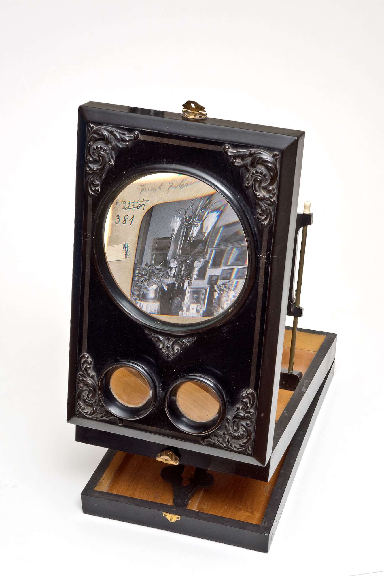 legno, divisa orizzontalmente in tre sezioni incernierate fra loro. Il coperchio reca una grossa lente biconvessa, trattenuta da un anello e usata come lente di ingrandimento; sotto di essa, pure incastonate in anelli di legno, due lenti convergenti più piccole formano gli oculari di uno stereoscopio. Il coperchio si apre con un'asta che si fissa perpendicolarmente alla sezione mediana della scatola. In questa si trova un piccolo leggio ribaltabile e scorrevole verticalmente lungo due asticelle d'ottone. La distanza dalle lenti può essere regolata lungo apposite guide. Il coperchio e il porta leggio possono poi venire inclinati grazie ad un piedino mobile che si incastra nel fondo della scatola. Le immagini stereoscopiche si pongono sul leggio e, spostandolo, si effettua la messa a