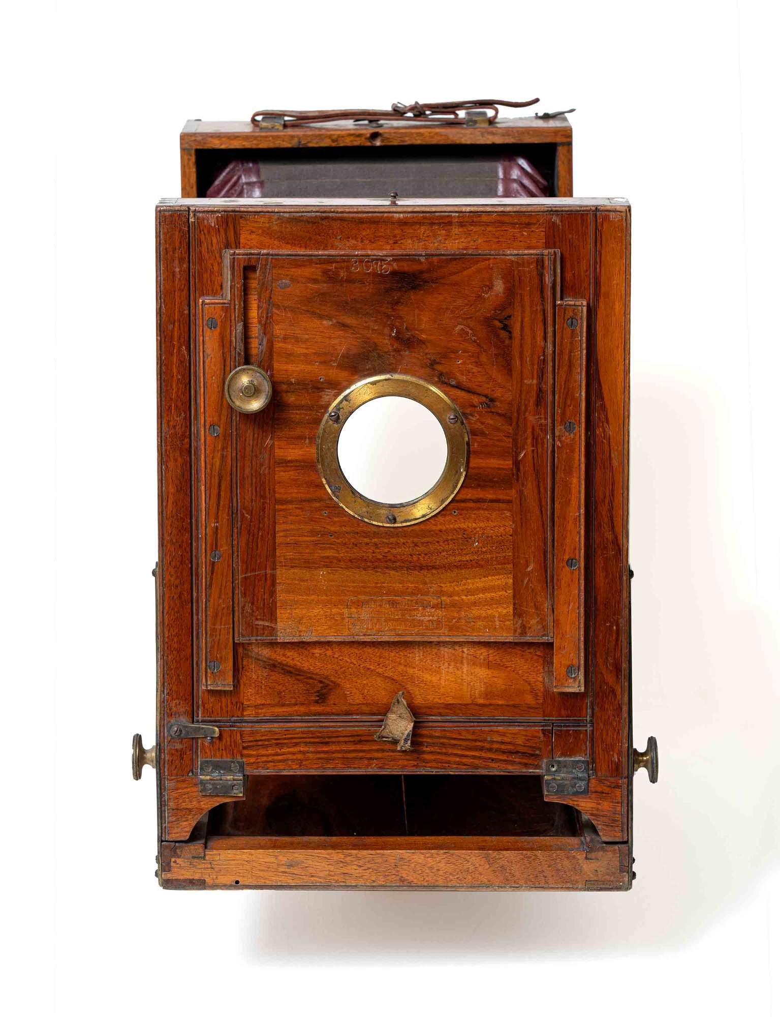 Apparecchio in legno con soffietto in pelle con maniglia in cuoio per il trasporto. L’apparecchio veniva ripiegato per minor ingombro e per proteggere il soffietto. Frontalmente è inserito il portaobiettivo, su un supporto in legno scorrevole sia orizzontalmente che verticalmente. L’ottica è mancante. Attraverso due rotelle poste lateralmente era possibile variare la distanza obiettivo- lastra, permettendo la messa a fuoco.