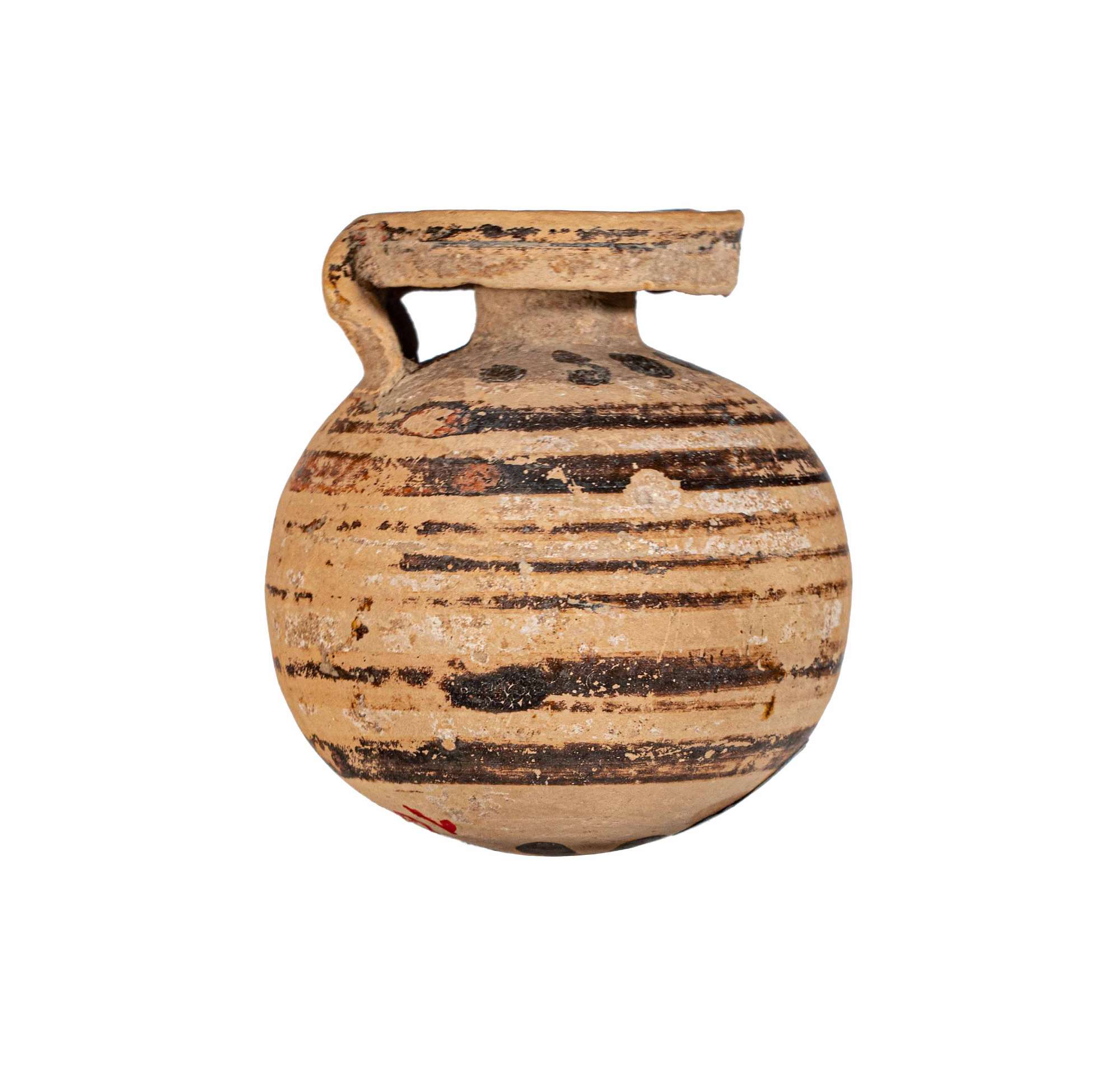 Aryballos corinzio a fasce brune sul ventre e sull'orlo, con poche foglie lungo il collo ed alla base.