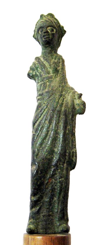 Statuetta femminile che veste una tunica talare coperta da un mantello gettato a tracolla sulla spalla sinistra, i cui drappeggi cadono sull'avambraccio. Una cintola stringe la veste sotto il petto. La mano sinistra è tesa in avanti aperta. Il capo è ornato con un diadema a tre coppie di piccoli lobi. I lineamenti sono rozzamente incisi sul volto tondo.