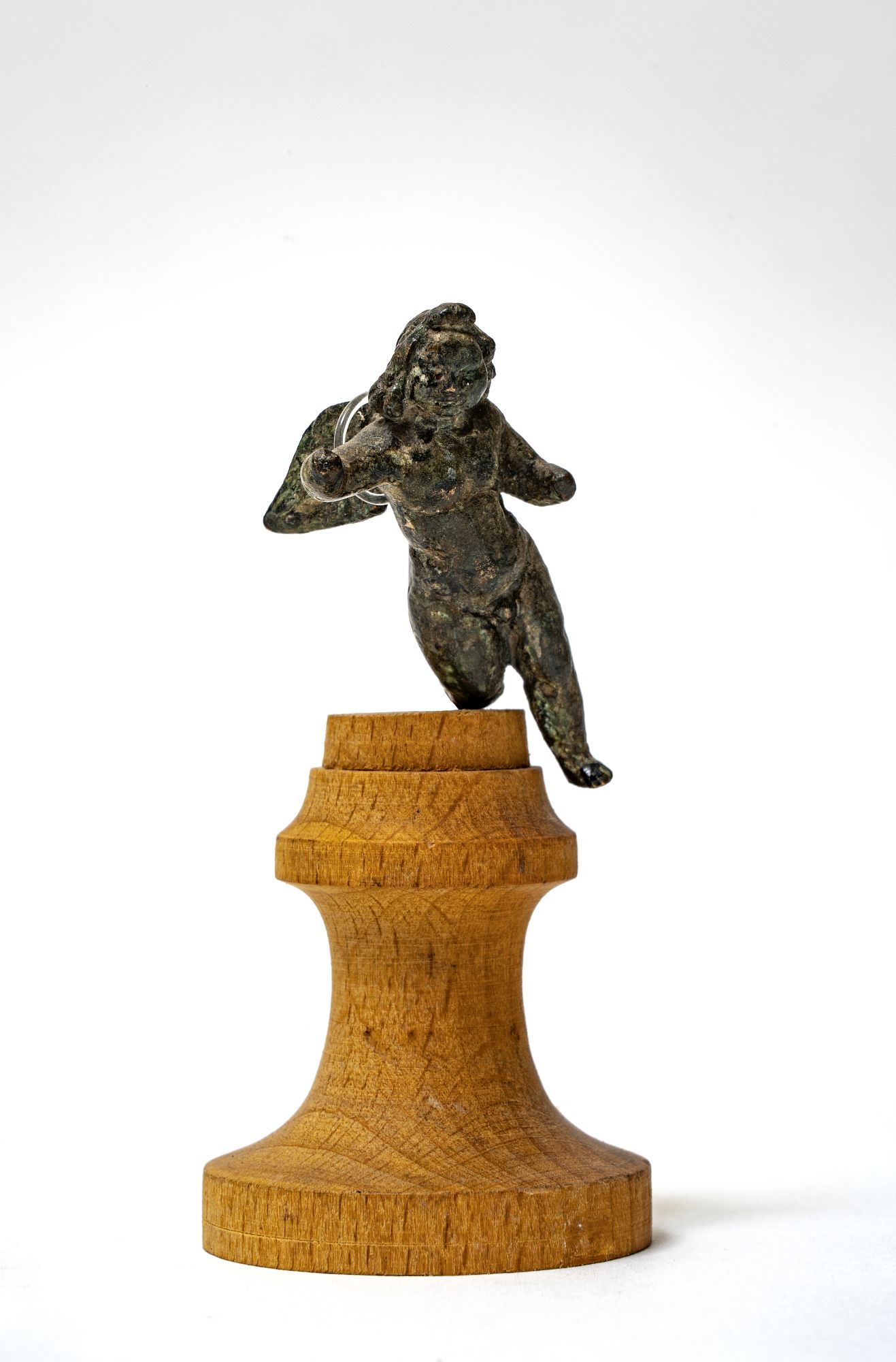 Puttino o amorino in atto di correre. La gamba destra è sollevata indietro, mentre la sinistra si punta dritta innanzi. Il braccio destro è levato in avanti, il sinistro piegato un po' di lato. La testa si flette verso sinistra in atto grazioso.