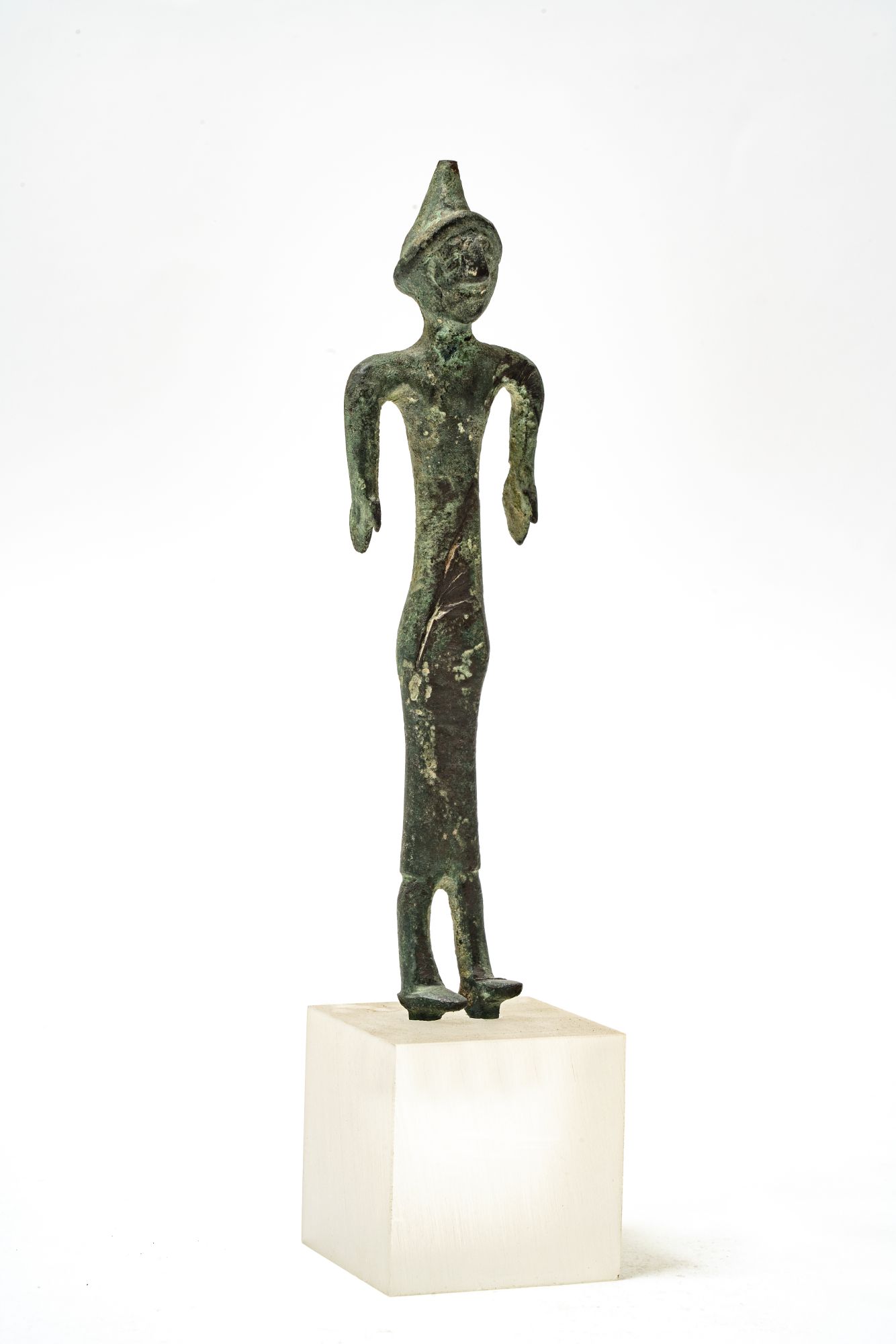 Figurina arcaica assai allungata e gambe sproporzionatamente basse. Il volto è triangolare, naso a becco, occhi a mandorla inclinati, cappello conico. Leggero chitone con solco trasversale al centro.