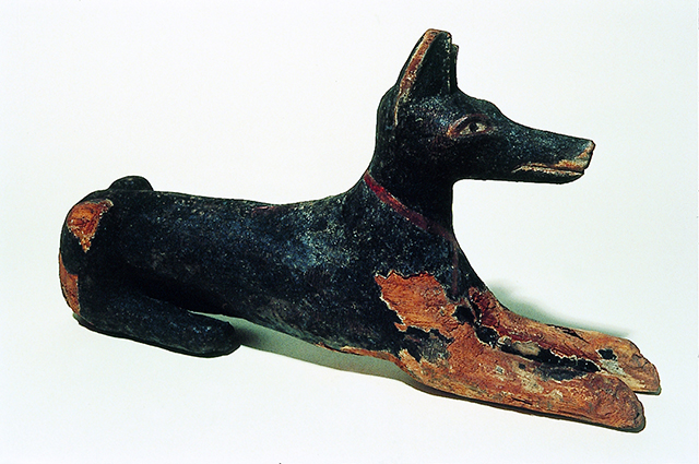 Queste figure di cane o sciacallo disteso erano normalmente poste, da sole o in coppia, sui coperchi dei sarcofagi qersu tipici della XXV dinastia. La divinità raffigurata è Upuaut, l’“apritore delle strade”, un dio di ambito esclusivamente funerario che venne poi associato ad Anubi. La sua funzione era quella di garantire al defunto un passaggio sicuro per l’aldilà. L’aspetto di Upuaut è quello tipico: un canide disteso, con le zampe anteriori allungate, il manto di colore nero, il lungo muso appuntito dalle grandi orecchie, ed una sciarpa rossa annodata al collo. La lunga coda che pendeva diritta verso il basso ora perduta, scolpita a parte, era fissata con un perno in legno, il cui foro si trova sotto la parte posteriore. La bocca, resa con un segno inciso in profondità, ha le estremità leggermente ricurve verso il basso ed è sottolineata con colore bianco e rosso. Il naso in punta ha due piccoli fori per le narici ravvicinate. Gli occhi sono bistrati in rosso con iride nera nella cornea bianca e hanno sopracciglia lineari dipinte anch’esse in rosso. Le orecchie, con interno a sottosquadro, sono danneggiate.