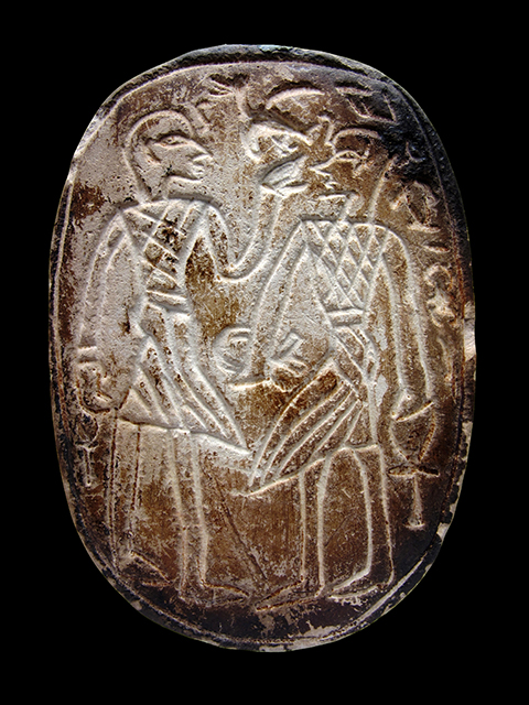 Scarabeo in steatite grigia con sul ventre raffigurazione di due personaggi maschili col cranio rasato e ureo sulla fronte. Quello a sinistra tiene un ankh nella mano destra e con l’altra porge un’anatra al secondo, il quale ha un ankh in una mano e una benda nell’altra. Dietro il capo di quest’ultimo vi sono dei segni geroglifici, forse un nome regale. Dorso con un’elaborata testa d’ariete e doppia incisione a T che separa protorace ed elitre. In basso si vede l’inizio del foro longitudinale, mai completato. Autenticità dubbia.
