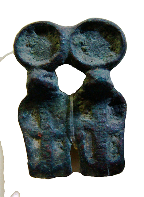 Questi elementi bronzei potevano essere fissati a corone realmente indossate o a statue, come ornamento, e rappresentano il cobra con il collo gonfio, o ureo, che – posto sulla fronte degli dei o del faraone – aveva il compito di proteggere chi lo portava; in questo caso la figura è doppia. La testa è ben distinta dal corpo, il collo rigonfio è spesso articolato in sei partizioni, che probabilmente erano riempite con smalti policromi, e sopra la testa c’è il disco solare, anch’esso con il bordo rialzato per contenere lo smalto, che veniva versato fuso nella cavità. Il corpo è normalmente arrotolato su se stesso alla base del collo.