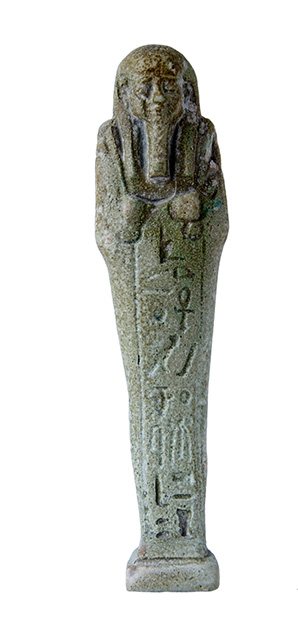 Statuina funeraria mummiforme che indossa una parrucca tripartita e la barba divina intrecciata. In ciascuna delle mani incrociate e affiancate tiene una zappa. Dietro la spalla sinistra pende una sacca. Il pilastro dorsale è presente e forma un tutt’uno con la piccola base. L’iscrizione in una singola colonna sulle gambe della statuina comprende soltanto il nome del defunto e quello della madre.