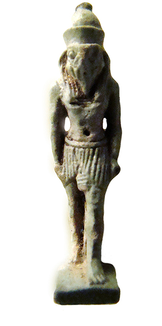 Bell'amuleto in faience raffigurante il dio Horus. Il dio è raffigurato in piedi, nell'atto di camminare (ha la gamba sinistra in avanti), con le braccia distese lungo il corpo e le mani chiuse a pugno. Il dio ha la consueta testa di falco, con un'ampia parrucca che ricade sulle spalle; sul capo ha la corona doppia dell'Alto e Basso Egitto; il corpo è nudo, ad eccezione del corto gonnellino pieghettato. I piedi poggiano su una base parallelepipeda che forma un tutt'uno con il pilastro dorsale, attraverso il quale c'è il foro passante per la sospensione.