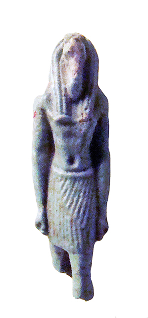 Amuleto in faience che raffigura il dio Thot, dio della sapienza e inventore dei geroglifici. Il dio è raffigurato in piedi, nell'atto di camminare (ha la gamba sinistra in avanti); la testa è quella dell'ibis, suo animale sacro, caratterizzata dal lungo becco a forma di falce lunare, con una parrucca striata che scende sul petto; al collo porta un ampio collare liscio; le braccia sono stese lungo il corpo, con le mani chiuse a pugno; indossa un corto gonnellino pieghettato. Le gambe sono spezzate all'altezza delle ginocchia.